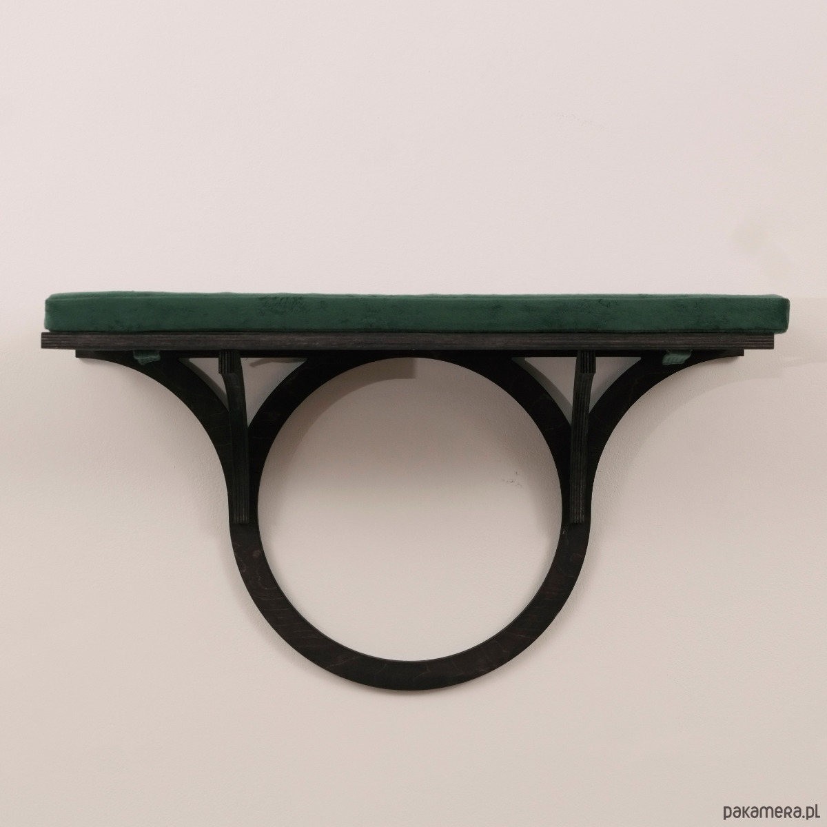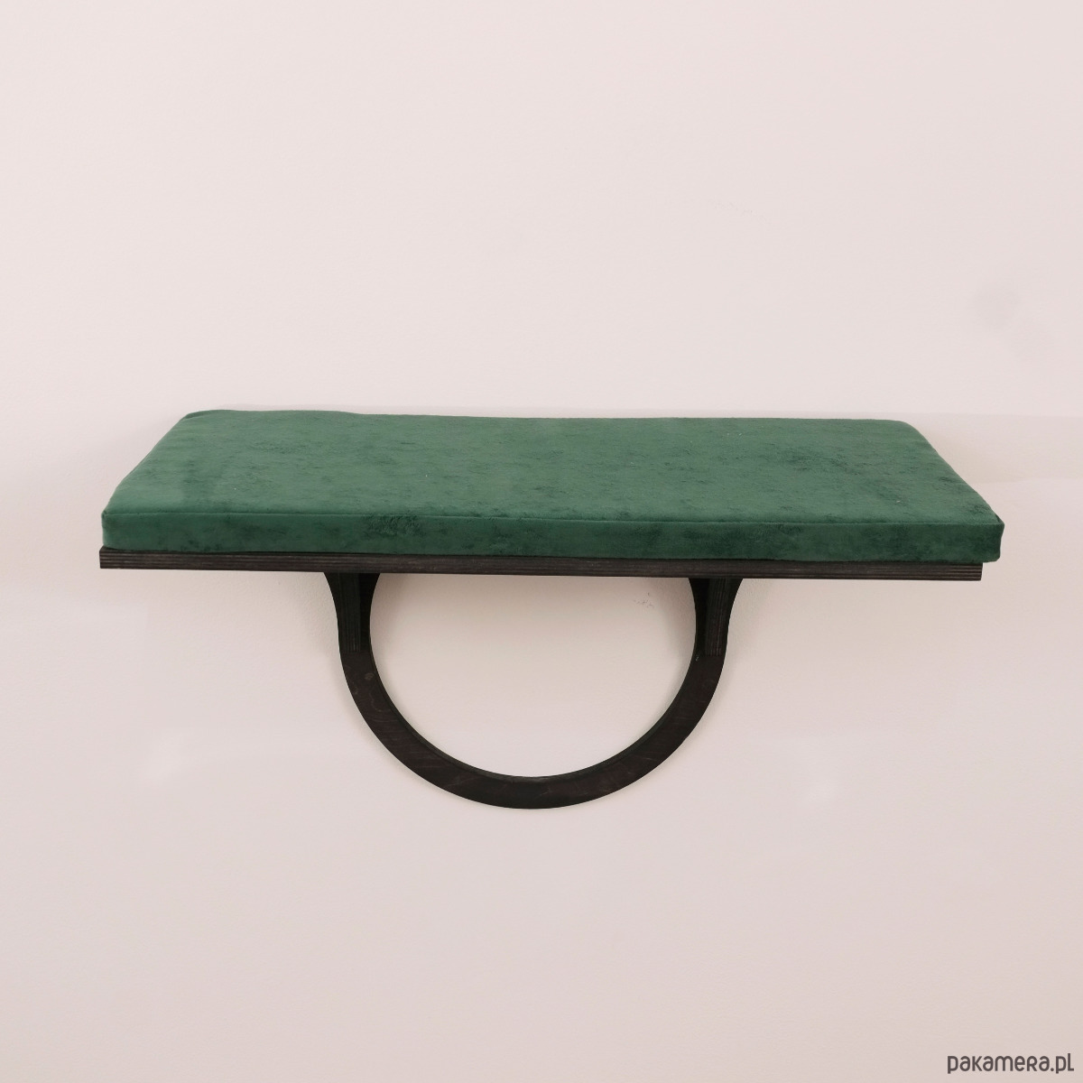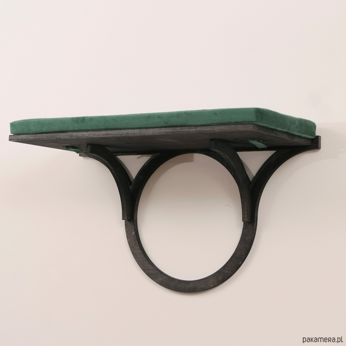 Aby urozmaicić design eleganckiej i prostej półki dla kota wprowadzony został kształt koła. Dzięki temu półka zachowała swoją estetykę, jednocześnie przyciąga uwagę swoim designem. Kotek dzięki prostokątnej poduszce zyska bezpieczną i komfortową przestrzeń, która będzie dla niego odskocznią od innych domowników w ciągu dnia.