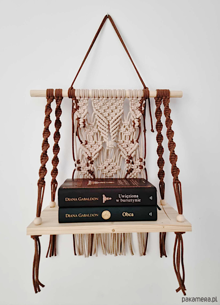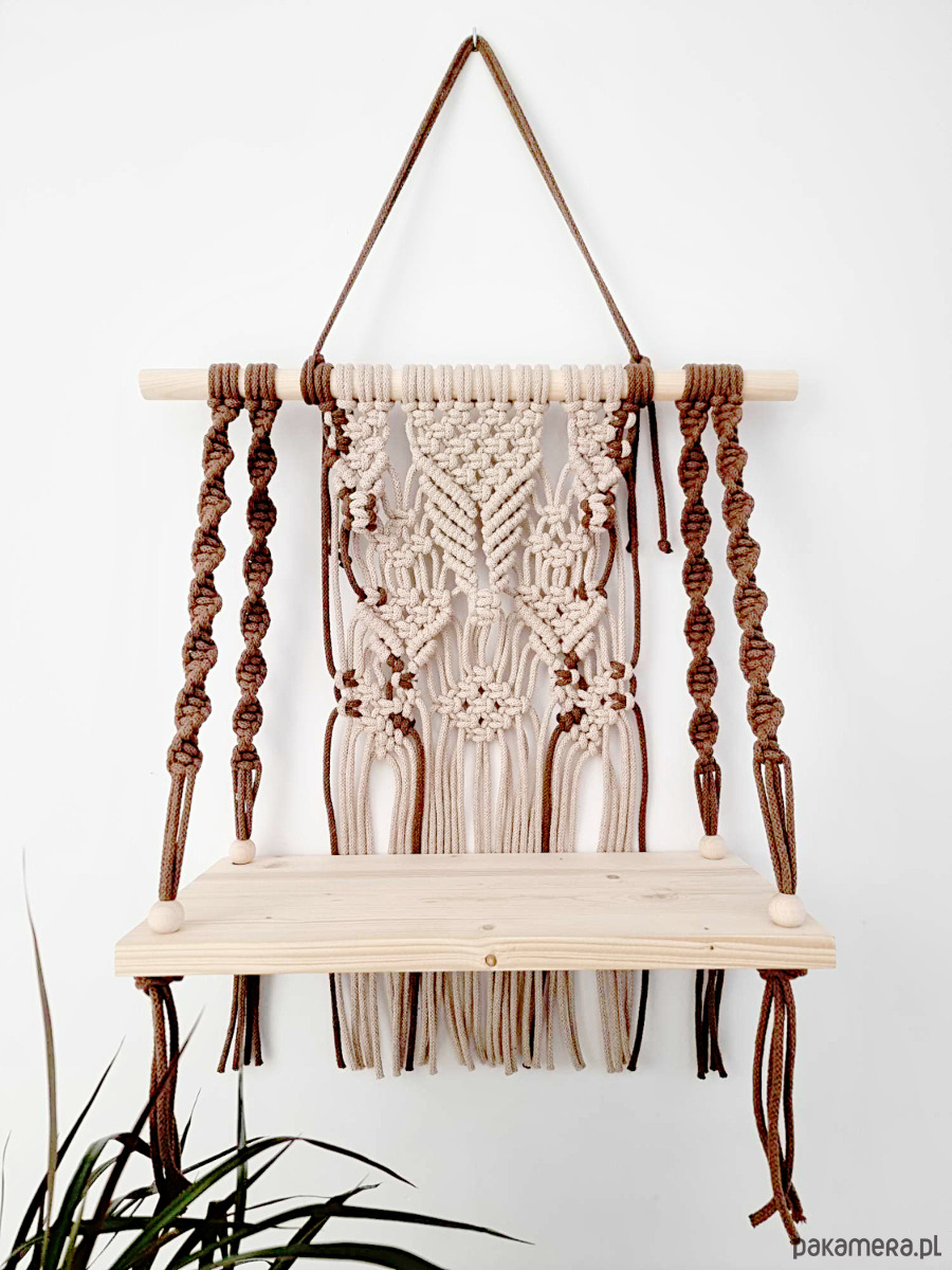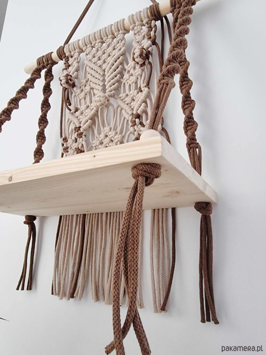 Sznurek bawełniany w odcieniach beżu i ciemnego brązu nadaje półce wyjątkowy, rustykalny urok.