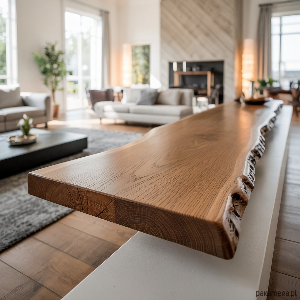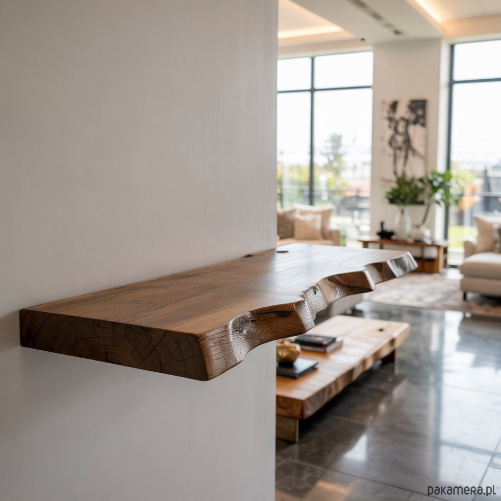 Półki z drewna dębowego jednego z najbardziej cenionych na świecie za swe walory wizualne jak też trwałość, półki dodatkowo posiadają tak zwane żywe krawędzie czyli są pozostawione z jednej strony w swym naturalnym kształcie co jeszcze bardziej zbliża je do natury i przyciąga wzrok oglądających