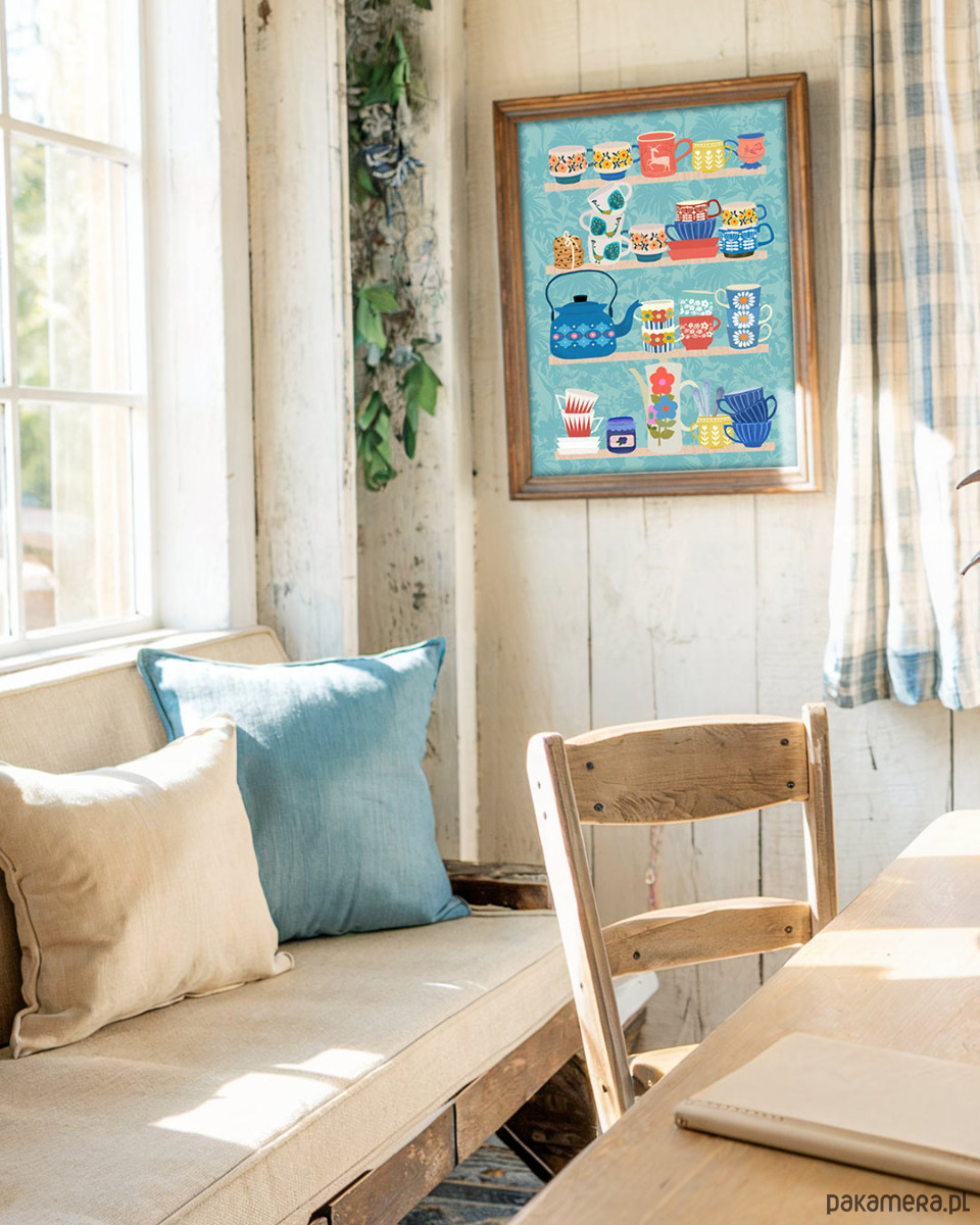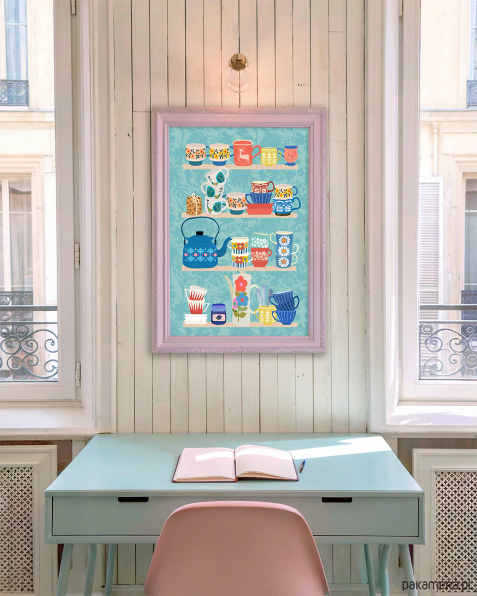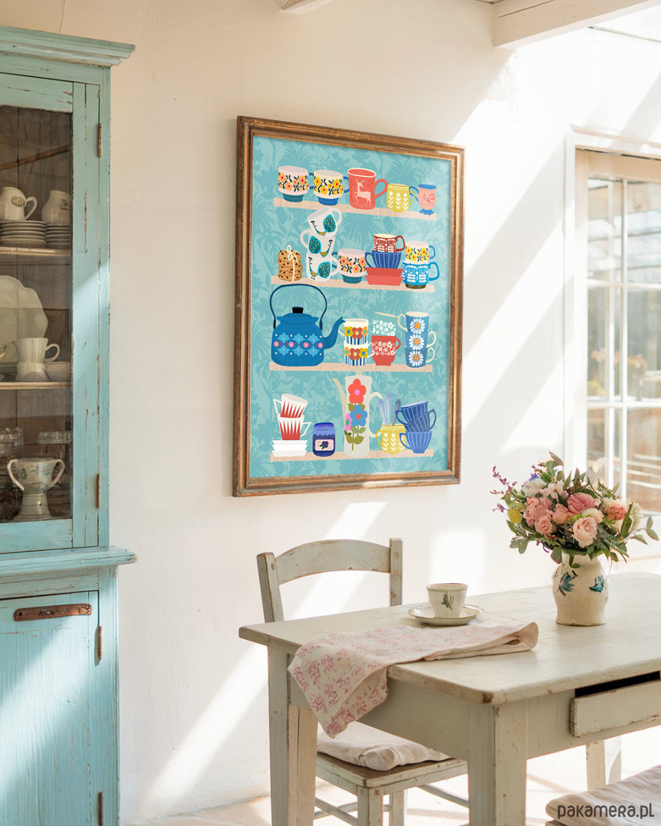 Plakat Półka w stylu retro to idealne rozwiązanie dla wszystkich tych, którzy nie mogą przejść obojętnie obok kolejnego ręcznie malowanego kubeczka, czy miseczki, choć wiedzą, że absolutnie niczego już nie da się wcisnąć do kuchennej szafki. Dekoracja kuchni i jadalni, która zaspokoi głód pięknych przedmiotów bez obciążania półek.