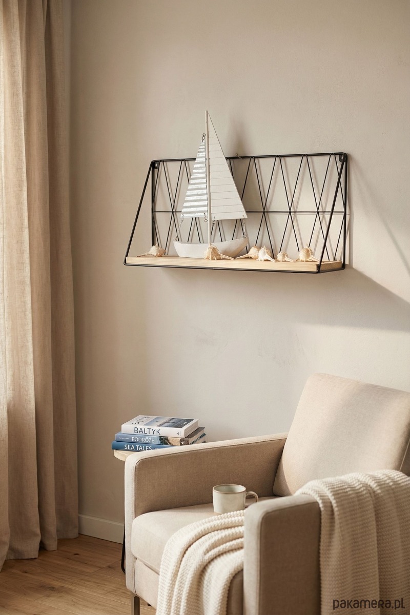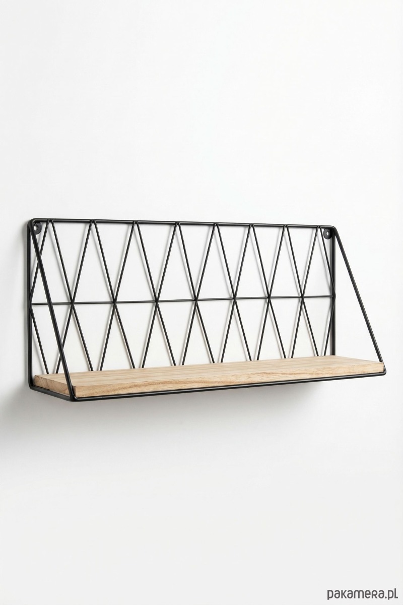 Konstrukcja półki wykonana jest z malowanego proszkowo metalowego drutu w neutralnym odcieniu czerni, tworzącym geometryczny, ażurowy wzór w kształcie trójkątów. Całość ramy ma kształt trapezu, który nadaje jej dynamicznego i nowoczesnego wyglądu. Wewnątrz tej metalowej ramy osadzona jest pojedyncza, solidna drewniana deska w jasnym, naturalnym odcieniu, idealna do eksponowania ulubionych przedmiotów.