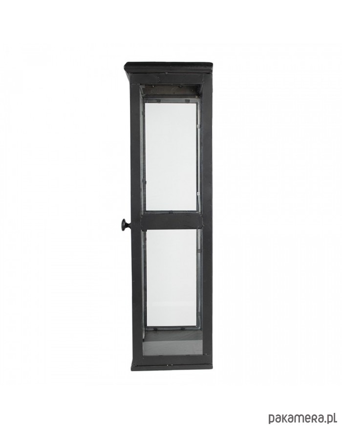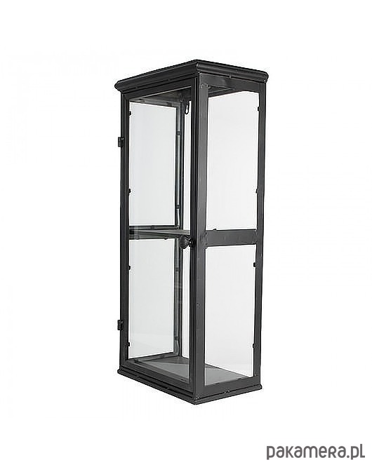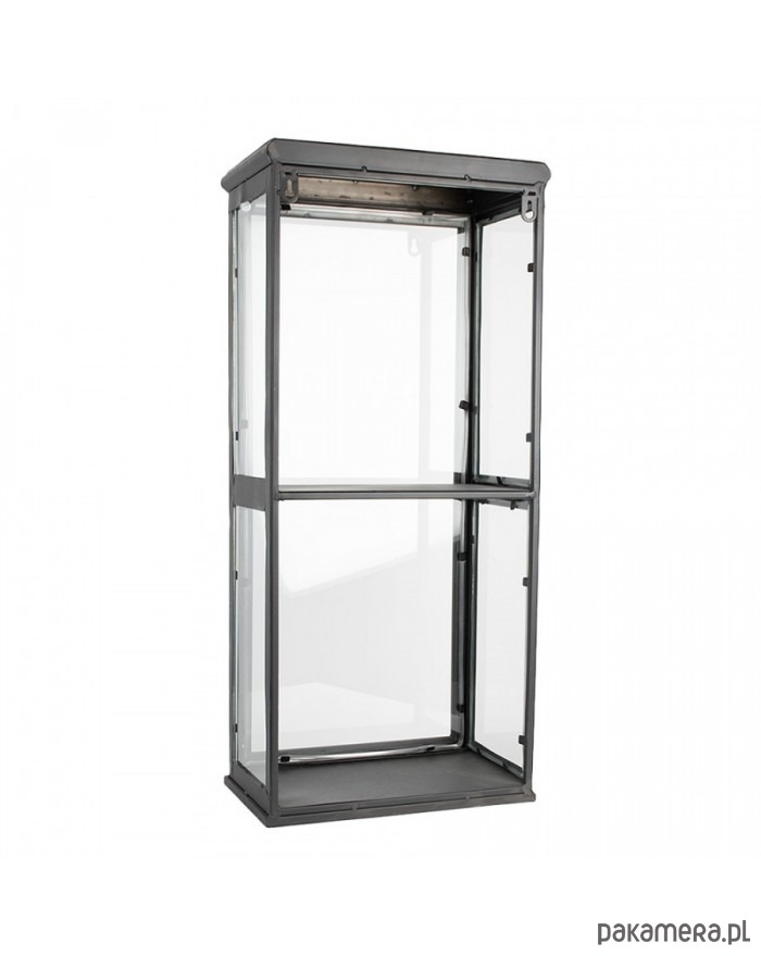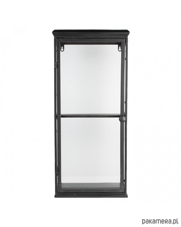 Ciekawa półka utrzymana w stylu industrialnym. Wykonana z metalu w kolorze czarnym oraz szkła. Posiada dwa haczyki do powieszenia. W tylnej części brak szybek. Drzwiczki zamykają się na magnes.