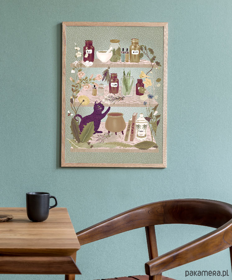 Plakat w stylu skandynawskim z autorską grafiką przedstawiającą półki z ziołową apteczką. Grafika utrzymana w naturalnych, stonowanych barwach będzie się pięknie prezentować na kuchennej ścianie lub w pokoju gościnnym. Zaprojektowany przez niemiecką artystkę Elisandrę Sevenstar.
