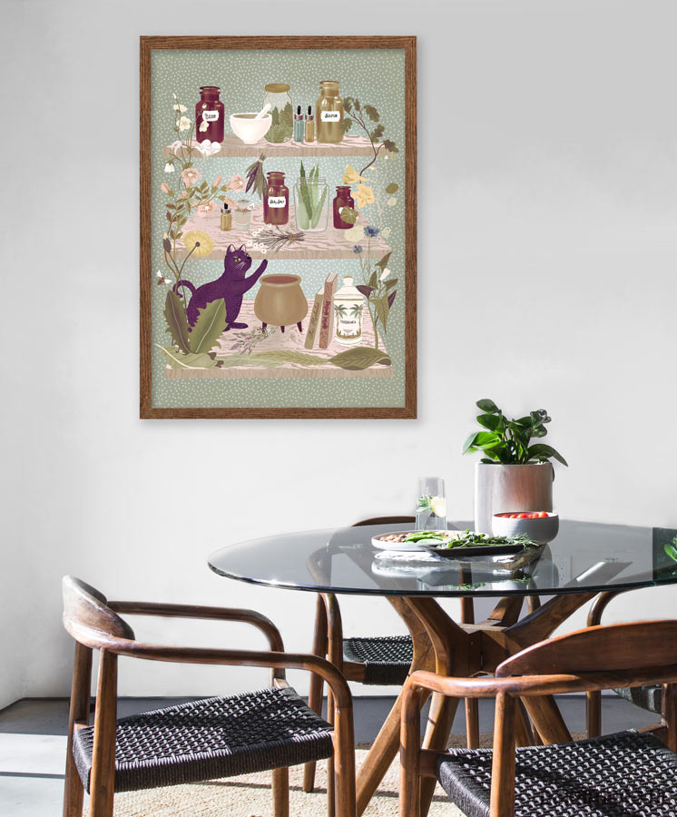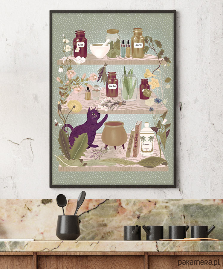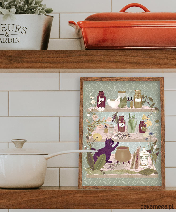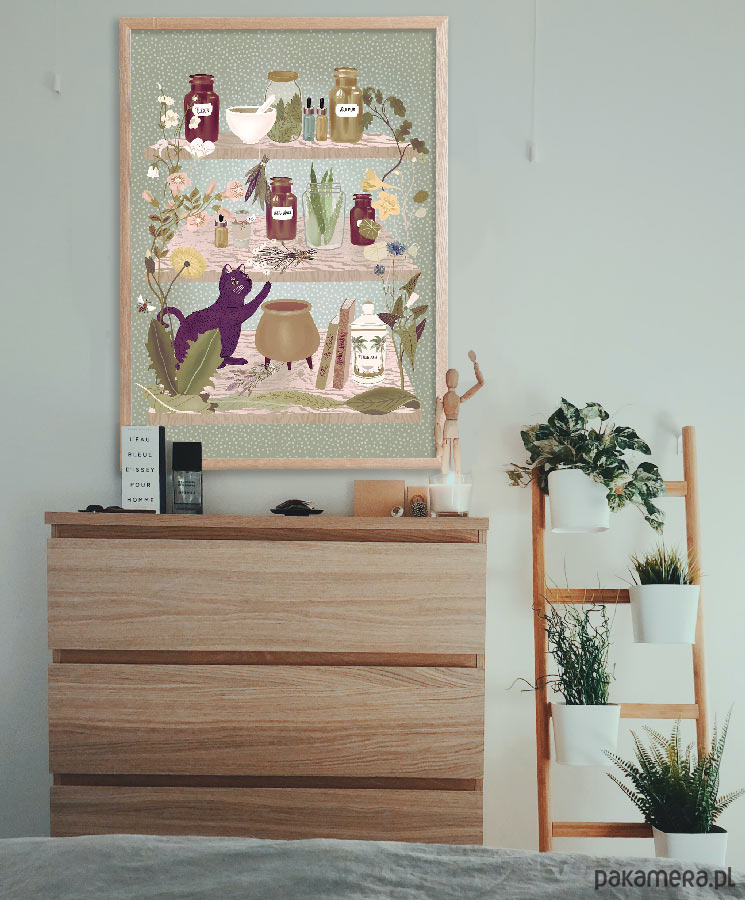Plakat w stylu skandynawskim z autorską grafiką przedstawiającą półki z ziołową apteczką. Grafika utrzymana w naturalnych, stonowanych barwach będzie się pięknie prezentować na kuchennej ścianie lub w pokoju gościnnym. Zaprojektowany przez niemiecką artystkę Elisandrę Sevenstar.
