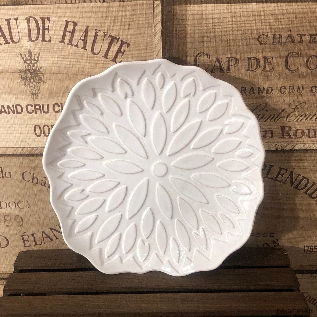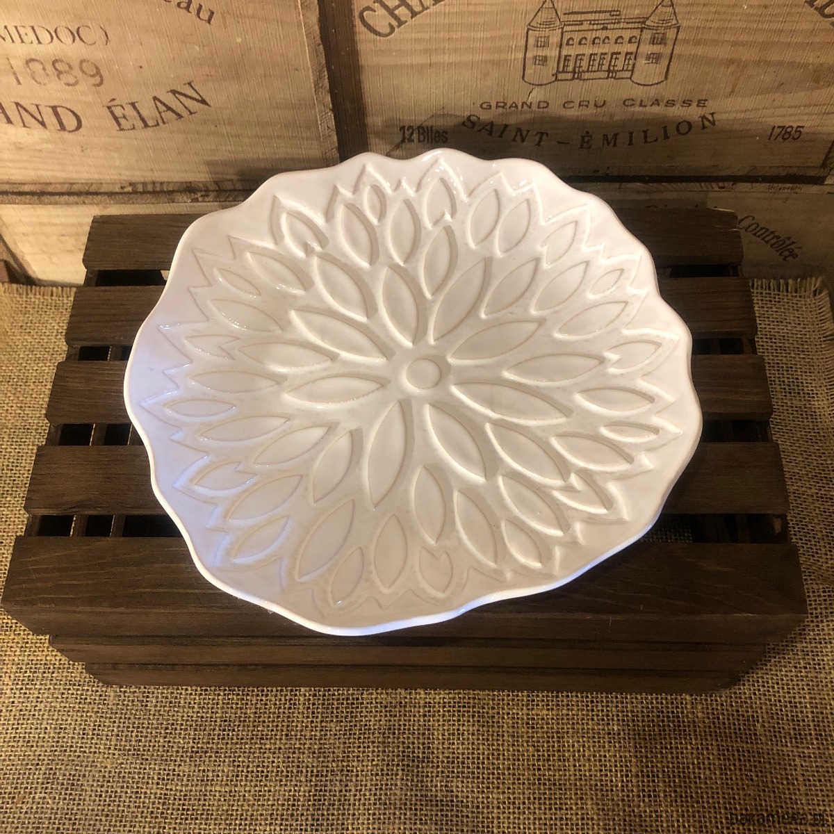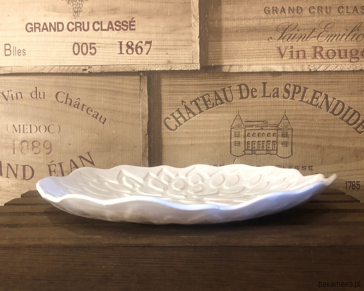 Półmisek w kolorze białym z odciśniętym oryginalnym wzorem. Wykonany ręcznie z jasnej gliny, pokryty szkliwem spożywczym (szkliwo zostało nałożone na wierzchnią część półmiska, spód z surowej gliny)