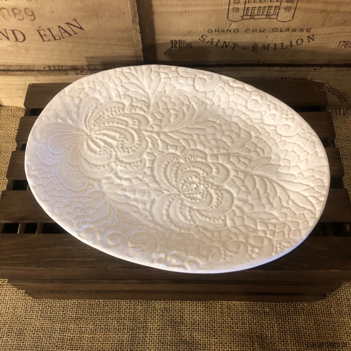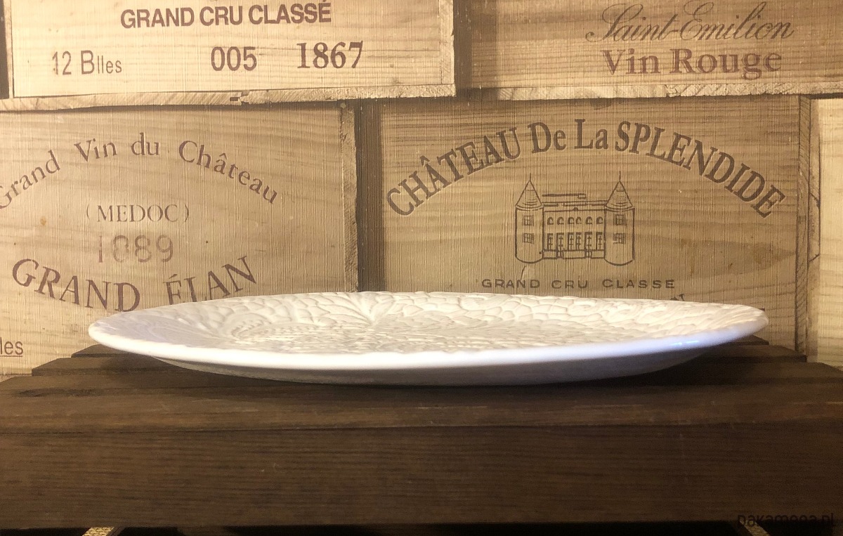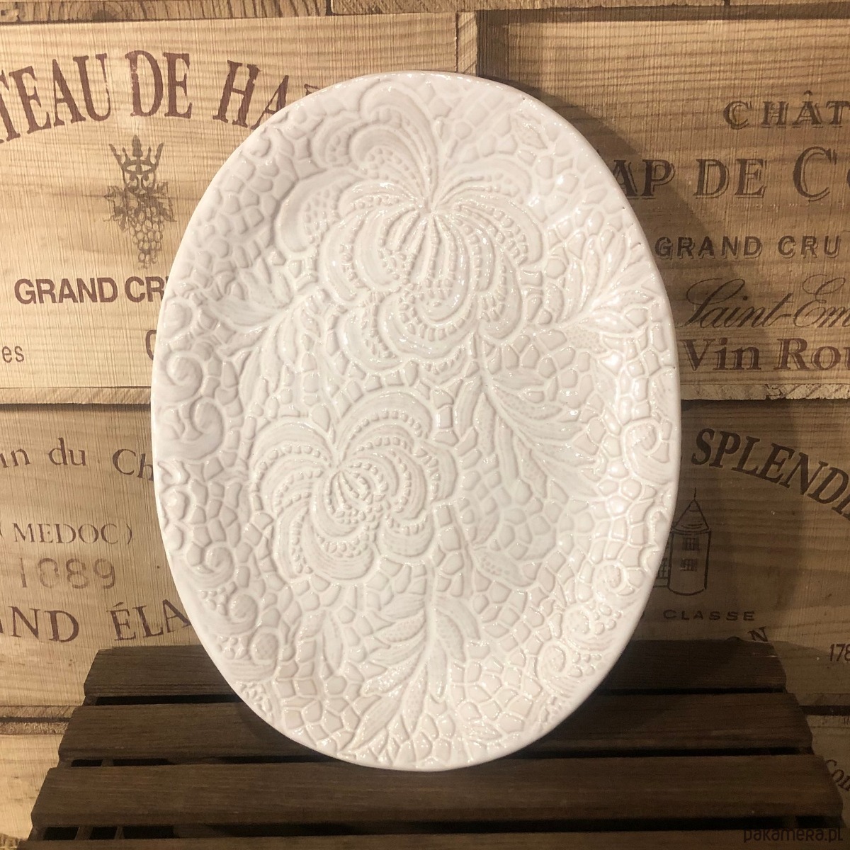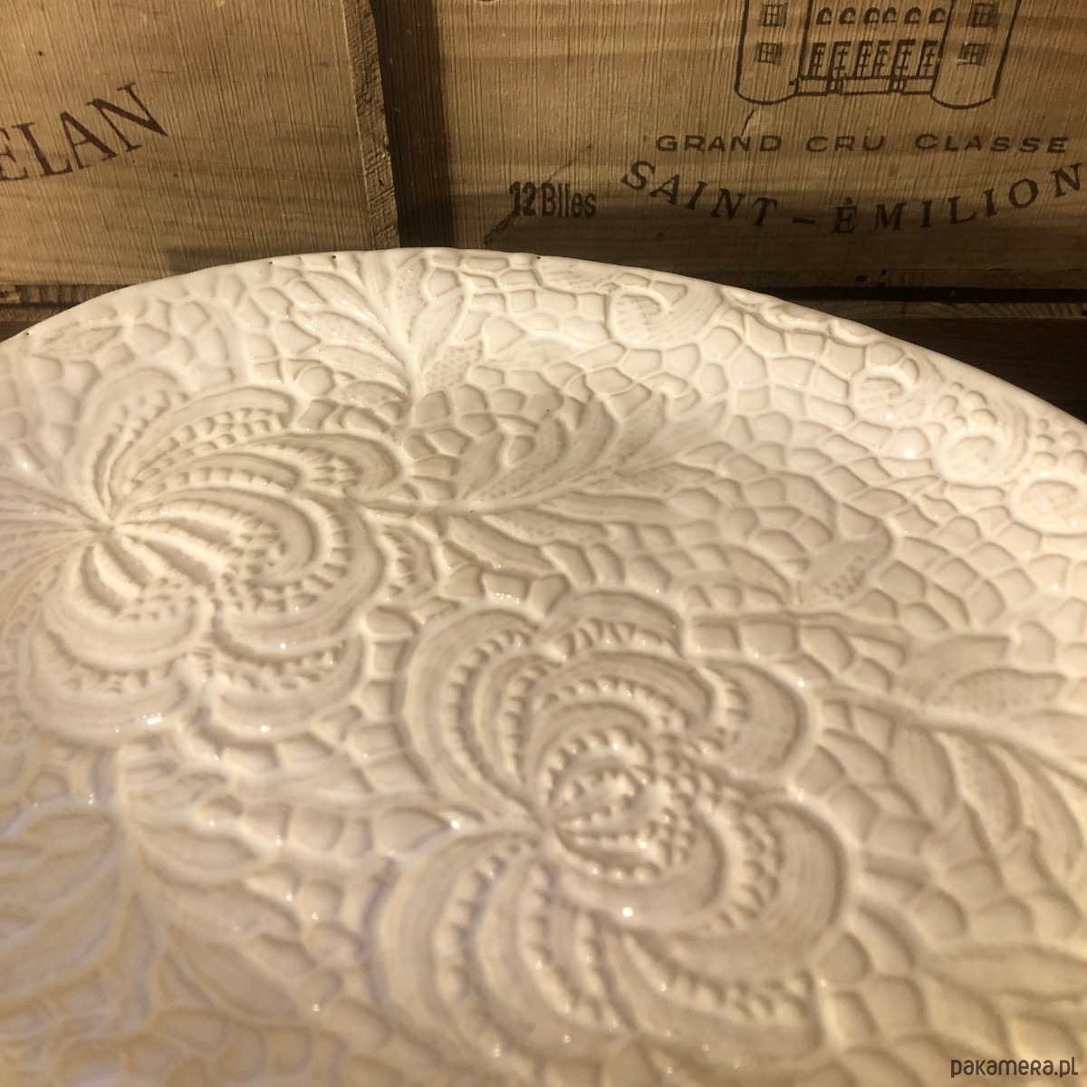 Półmisek w kolorze białym z odciśniętym wzorem koronki. Wykonany ręcznie z jasnej gliny, pokryty szkliwem spożywczym (szkliwo zostało nałożone na wierzchnią część półmiska, spód z surowej gliny)