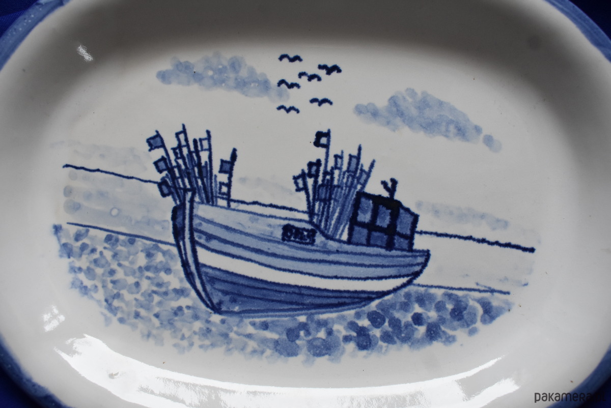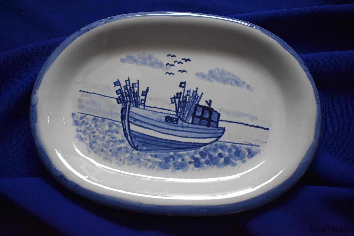 Ręcznie malowany półmisek ceramiczny utrzymany w klasycznym zestawieniu bieli i kobaltu. Motyw latarni morskich i statków został namalowany z wyjątkową precyzją tlenkiem kobaltu na białym szkliwie, tworząc unikalny, marynistyczny klimat.
