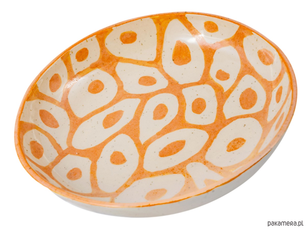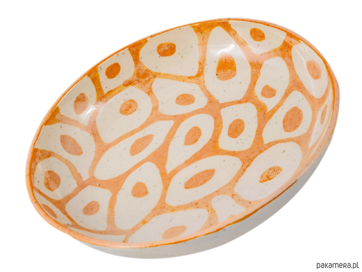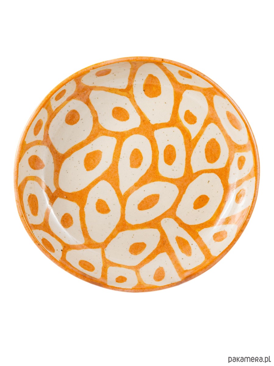 Półmisek ceramiczny lepiony ręcznie z jasnej, nakrapianej gliny, której naturalne drobinki subtelnie prześwitują przez szkliwo i podkreślają rzemieślniczy charakter formy. Wnętrze zdobi wyrazisty, organiczny wzór inspirowany afrykańskimi motywami dekoracyjnymi – nieregularne kształty i rytmiczne powtórzenia przywodzą na myśl malarstwo etniczne.