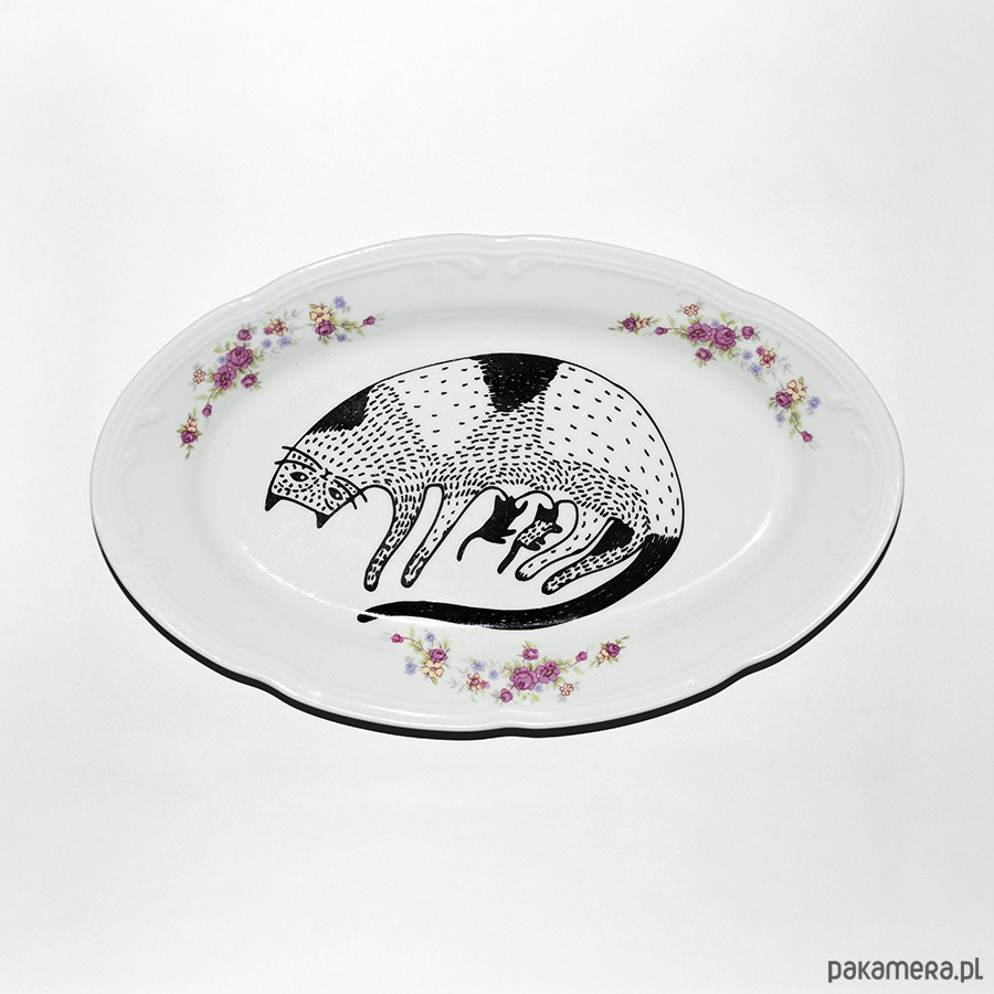 Duży porcelanowy półmisek z kocią mamą. Stworzony w duchu zero waste i upcykling - pochodzi z drugiej ręki. Kiedyś przez kogoś używany, później zapomniany, teraz ma szansę na nowy dom! Kupując przedmioty od Empe dbasz o naszą planetę ♥