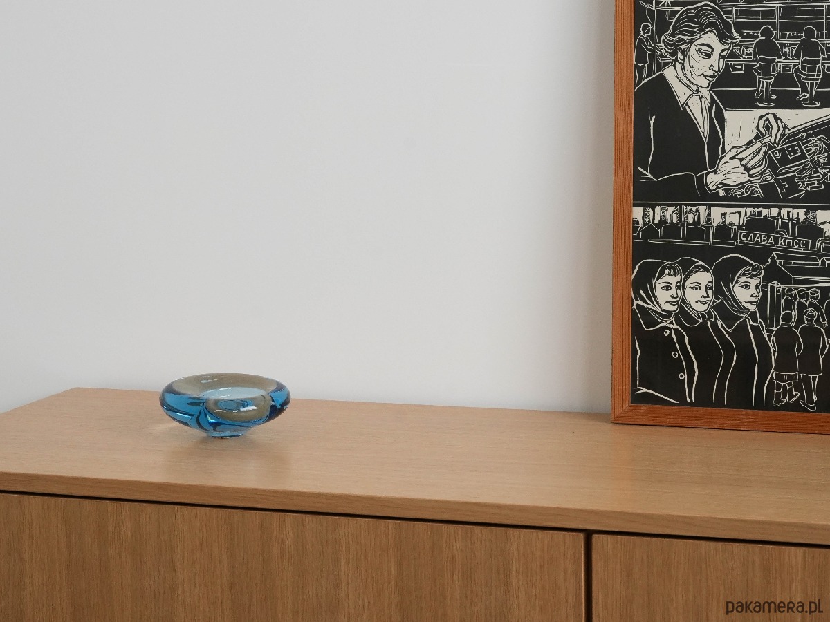 Szklany półmisek projektu Per'a Lütken'a dla duńskiej huty szkła Holmegaard. Wykonany został w latach 60-tych.