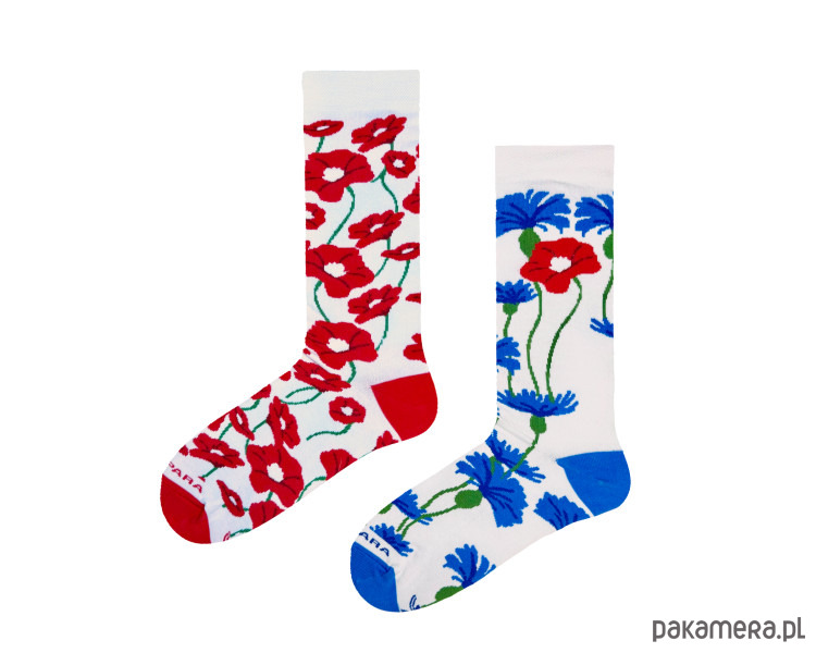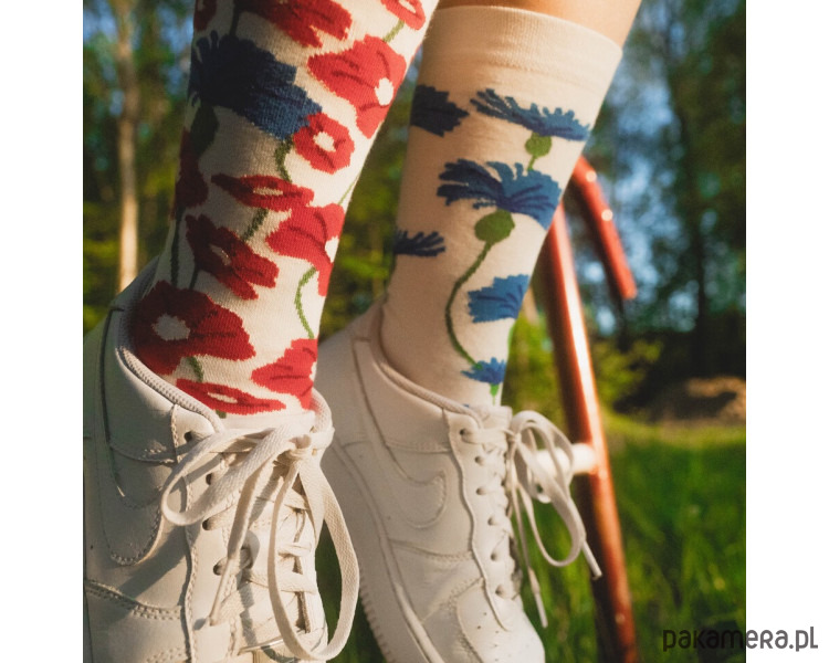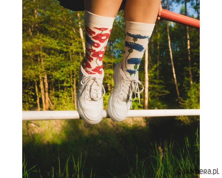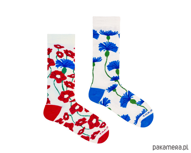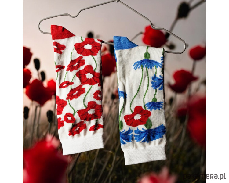 Czas porzucić nudne skarpetki i wkroczyć w sezon rozkwitu – poznaj skarpetki nie do pary Maki i Chabry od Takapara! Każda z nich inna, ale razem tworzą duet jak z wiosennej łąki. Z jednej strony ogniste czerwone maki – symbol pasji, życia i wspomnień. Z drugiej strony chabry – błękitne, nieco melancholijne, ale jednocześnie pełne świeżości i lekkości. W Polsce maki i chabry to klasyka – jak bigos i schabowy, ale w wersji stylowej i bardzo do noszenia. Te kolorowe luksusowe skarpetki rozkwitają na białym tle niczym kwiaty o poranku – a Ty możesz mieć je zawsze przy sobie, nawet gdy za oknem plucha. Dzięki intensywnym barwom – czerwieni, chabrowi i bieli – wprowadzają energię do każdej stylizacji. Pasują do sukienki, spódnicy, garnituru, a nawet do dresu, jeśli lubisz miksować kontrasty z przytupem. To nie są zwykłe piękne skarpetki. To małe dzieła sztuki, które opowiadają historię: o naturze, o wolności, o tym, że każdy dzień może być kolorowy – wystarczy spojrzeć w dół. Wykonane z wysokiej jakości bawełnianej dzianiny, są miękkie, przyjemne w dotyku i trwałe jak miłość do wiosennych łąk. Nie wiesz, co kupić na prezent dla mamy, siostry, przyjaciółki? Te skarpetki mówią same za siebie. Są subtelne, a jednocześnie wyraziste. Romantyczne, ale z pazurem. Dodają stylizacji lekkości i uroku. Polskie skarpetki, które pachną świeżością i odwagą, by wyrażać siebie na swój sposób. Stylizuj, łącz, eksperymentuj – bo życie to nie Instagramowy filtr, tylko wiosenna łąka pełna kolorów. A Ty jesteś jej najpiękniejszym kwiatem!