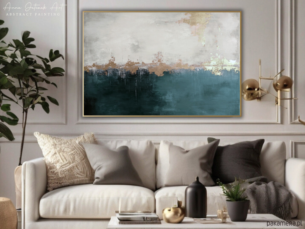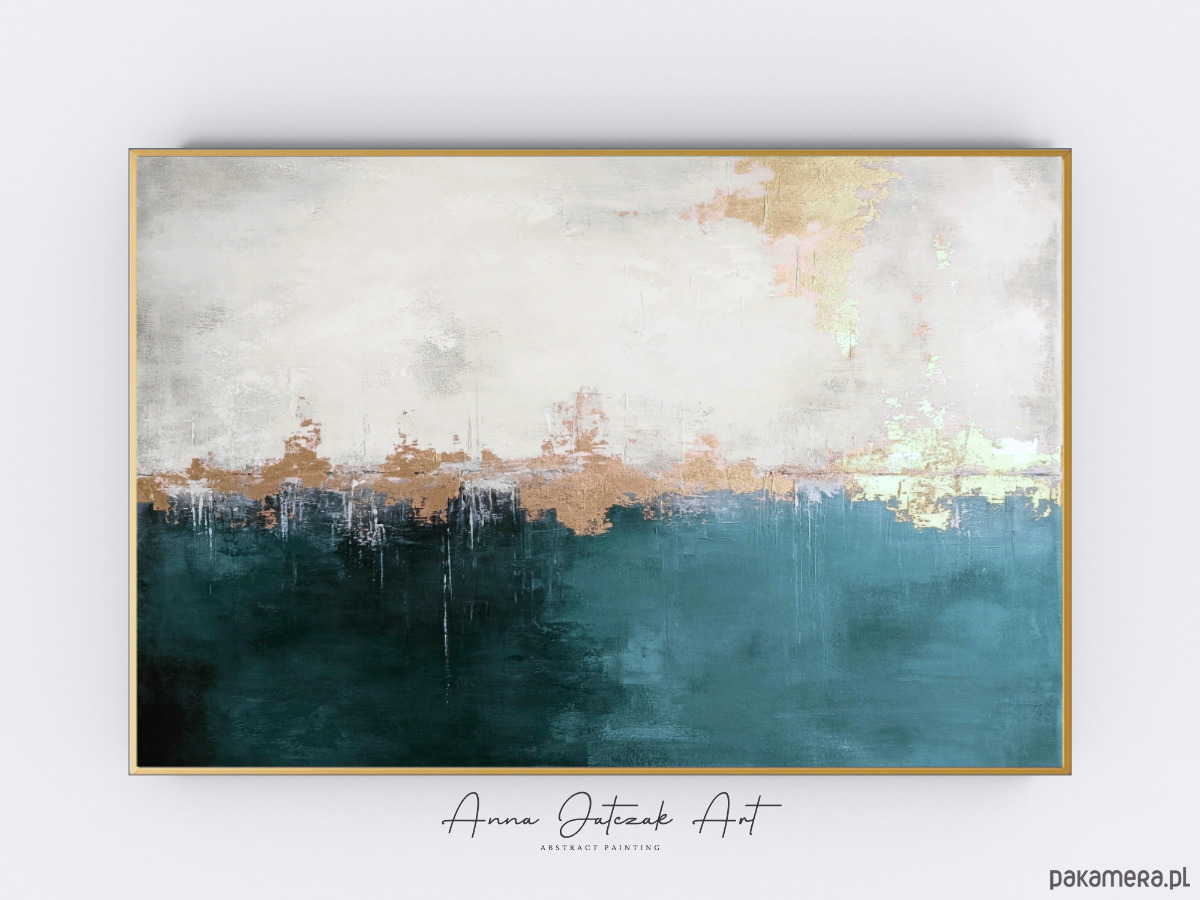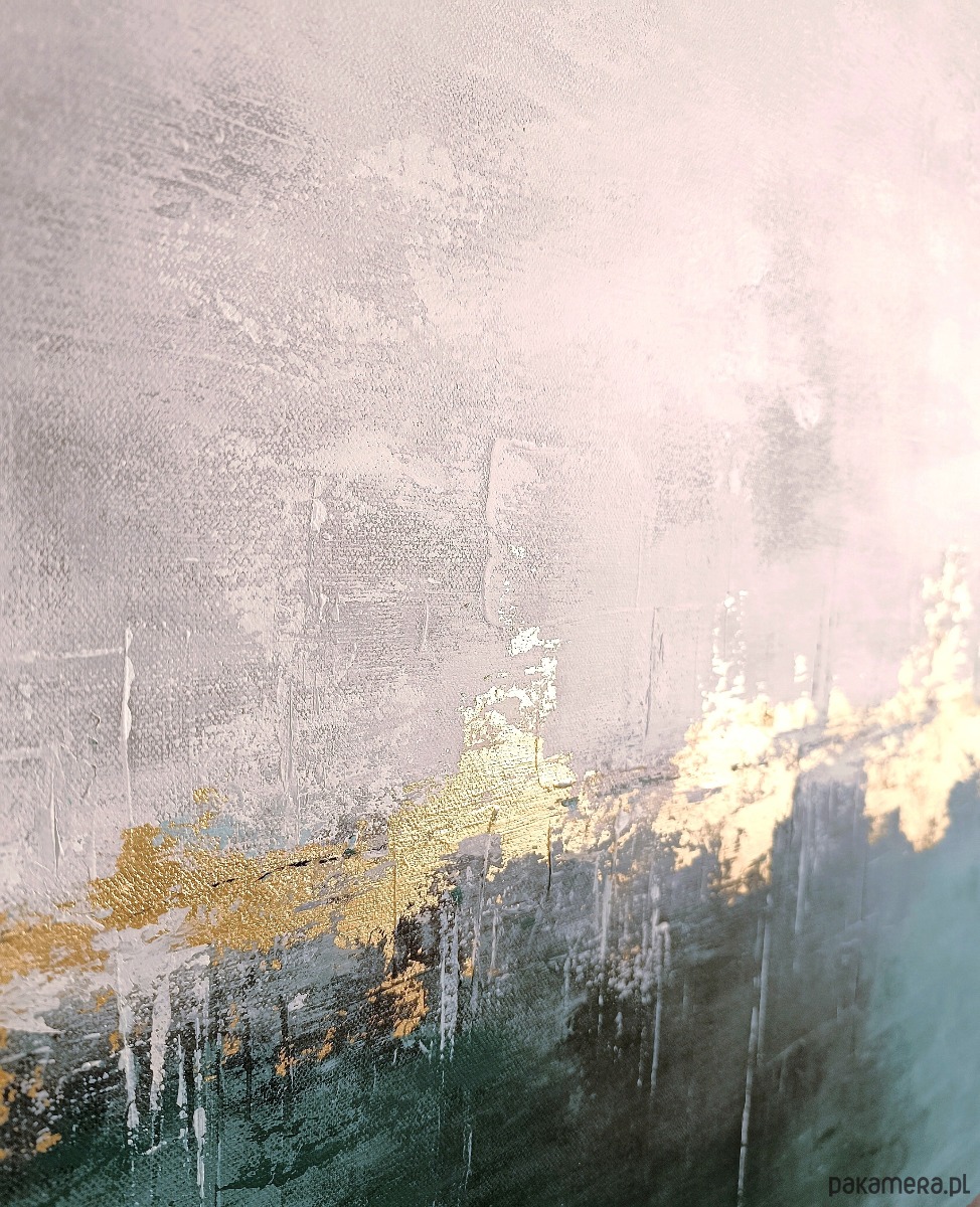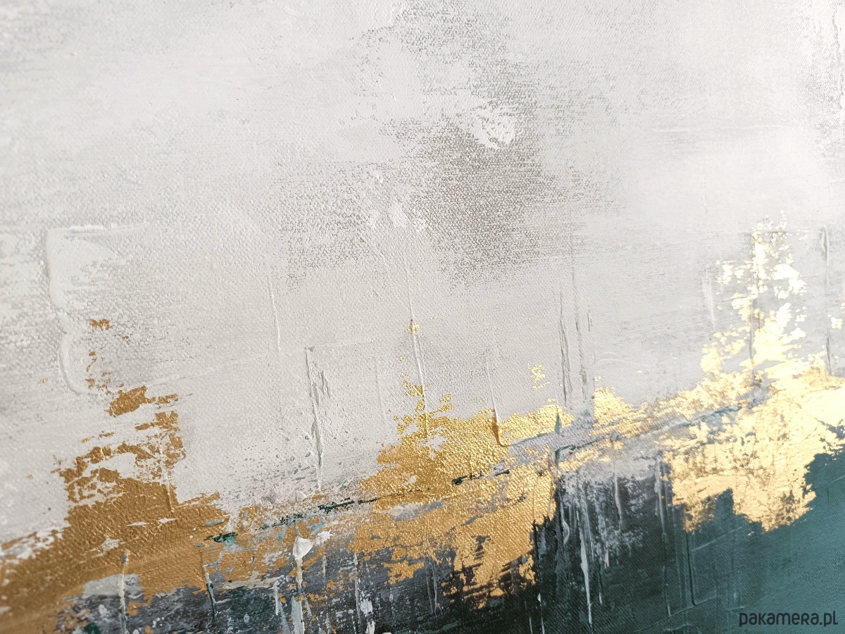 Ręcznie malowany obraz abstrakcyjny inspirowany nastrojowym światłem północy. Głębokie odcienie zieleni przełamane są jasnym beżem i złotymi akcentami, które nadają całości eleganckiego, nowoczesnego charakteru. Dzięki subtelnej teksturze i stonowanej kolorystyce, obraz idealnie wpisuje się we współczesne wnętrza – zarówno te minimalistyczne, jak i bardziej wyraziste.