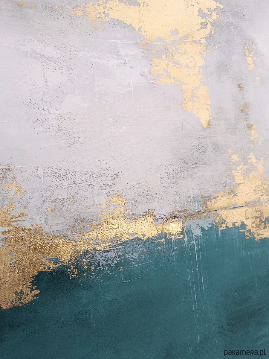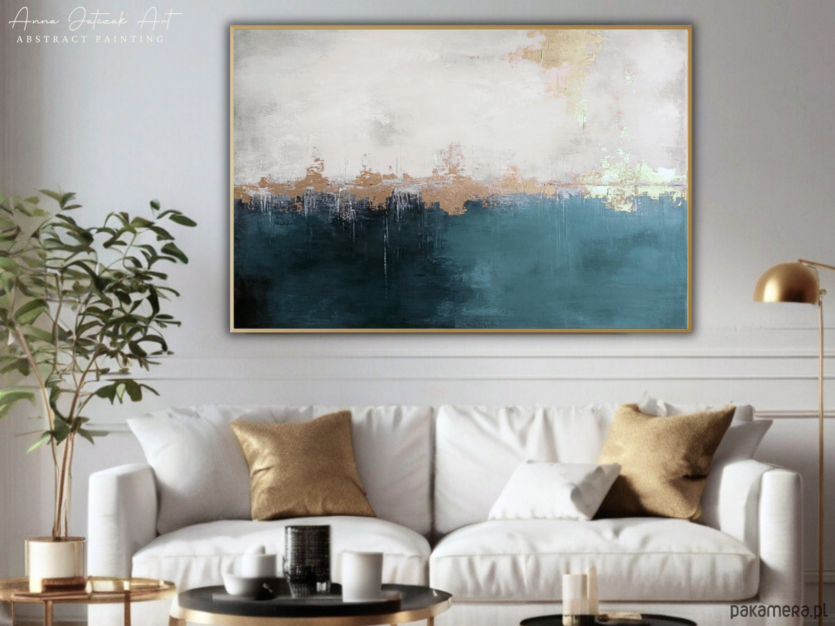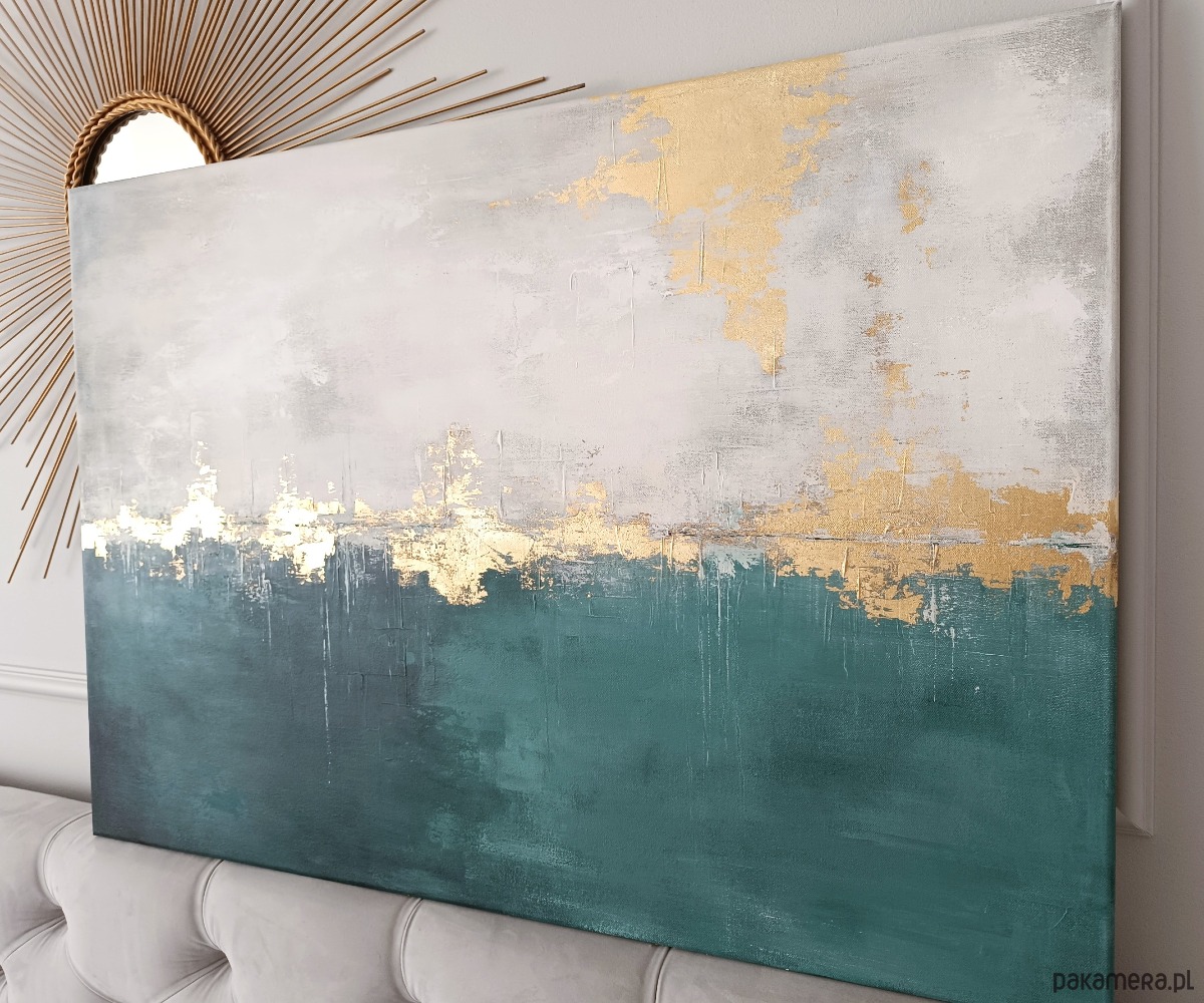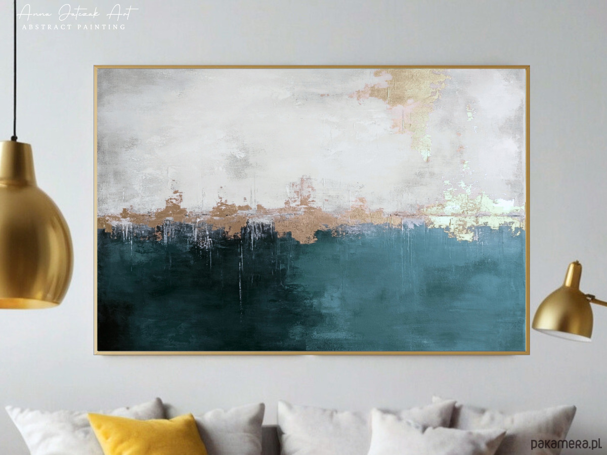 Ręcznie malowany obraz abstrakcyjny inspirowany nastrojowym światłem północy. Głębokie odcienie zieleni przełamane są jasnym beżem i złotymi akcentami, które nadają całości eleganckiego, nowoczesnego charakteru. Dzięki subtelnej teksturze i stonowanej kolorystyce, obraz idealnie wpisuje się we współczesne wnętrza – zarówno te minimalistyczne, jak i bardziej wyraziste.