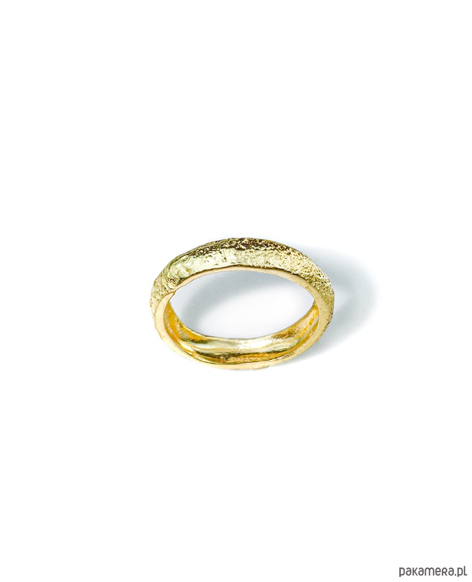Wyjątkowa, oryginalna obrączka o pękatej formie i fakturowanej powierzchni, wykonana ręcznie ze srebra 925, złocona 24 k złotem na 1,5 mikrona. Dostępna w sklepie również w wersji srebrnej.