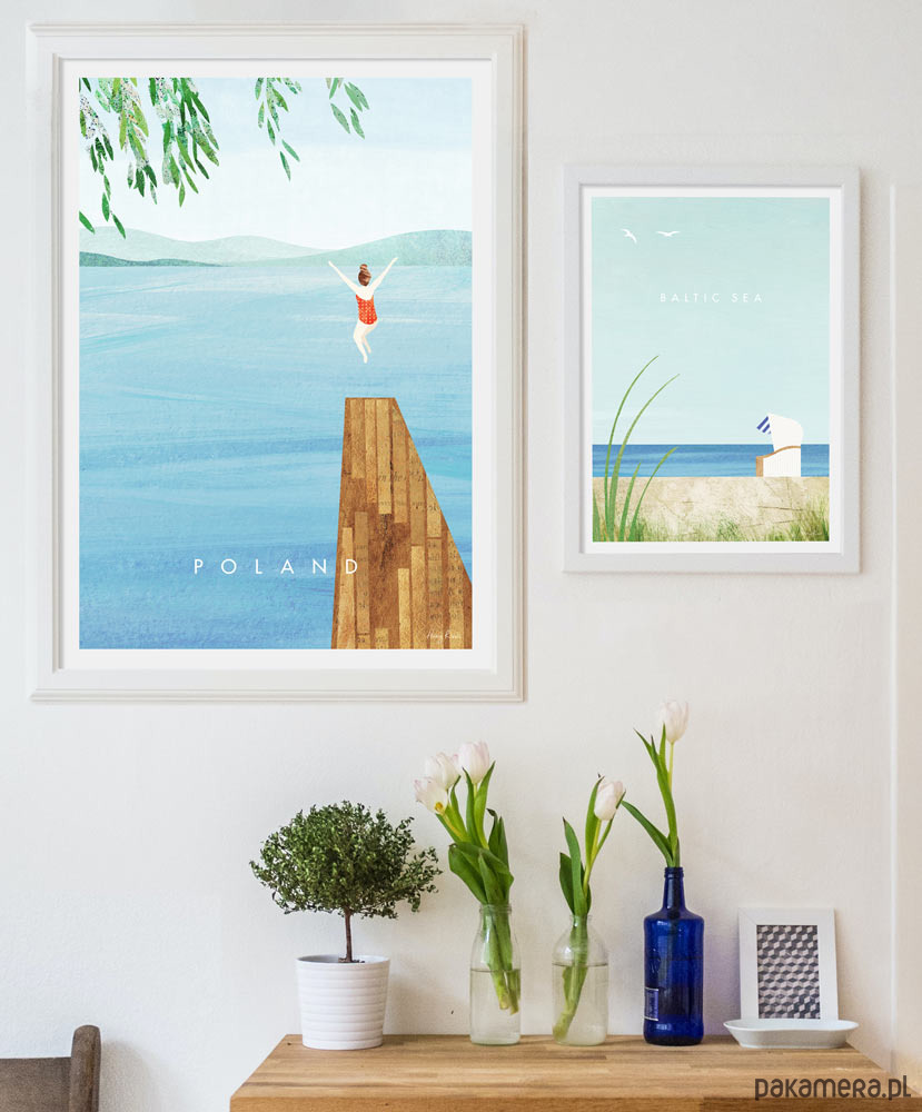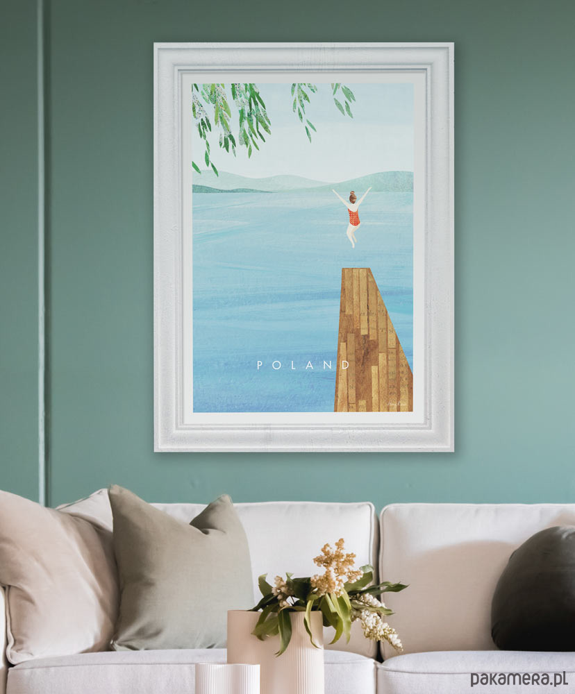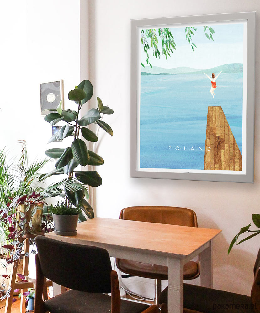Plakat podróżniczy w stylu retro - letni dzień nad jednym z polskich jezior. Pełen lekkości plakat z kojącym widokiem wody, przeniesie nas w atmosferę upalnego lata i jego beztroskich zabaw.