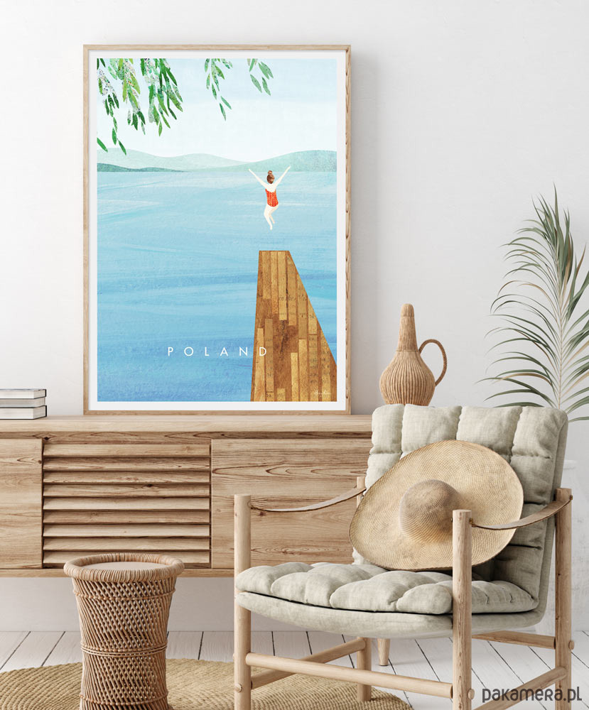 Plakat podróżniczy w stylu retro - letni dzień nad jednym z polskich jezior. Pełen lekkości plakat z kojącym widokiem wody, przeniesie nas w atmosferę upalnego lata i jego beztroskich zabaw.
