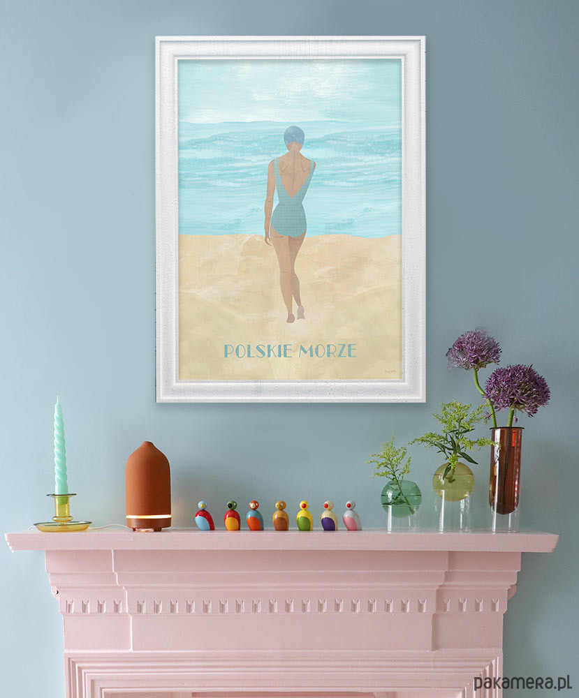 Plakat w stylu vintage przedstawiający plażowiczkę wpatrzoną w morze w letni, ciepły dzień. Nostalgiczna grafika pełna kojącego błękitu doskonale sprawdzi się na każdej ścianie.