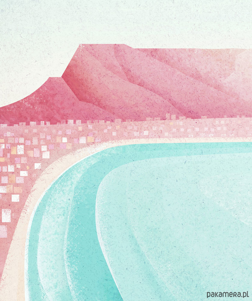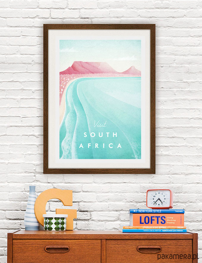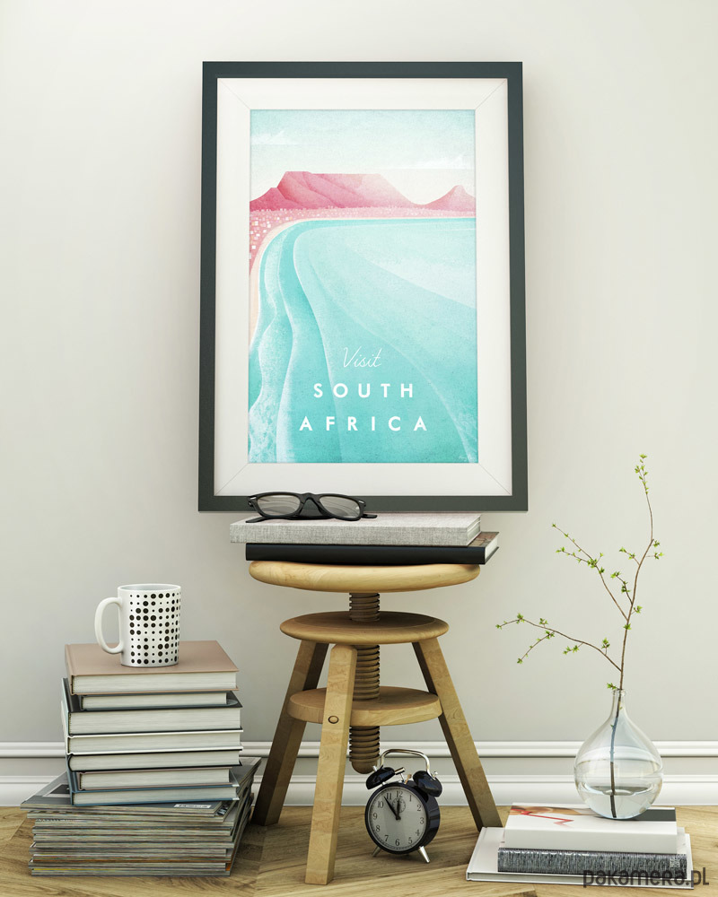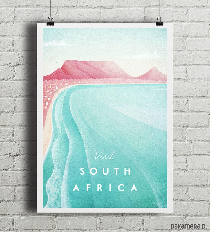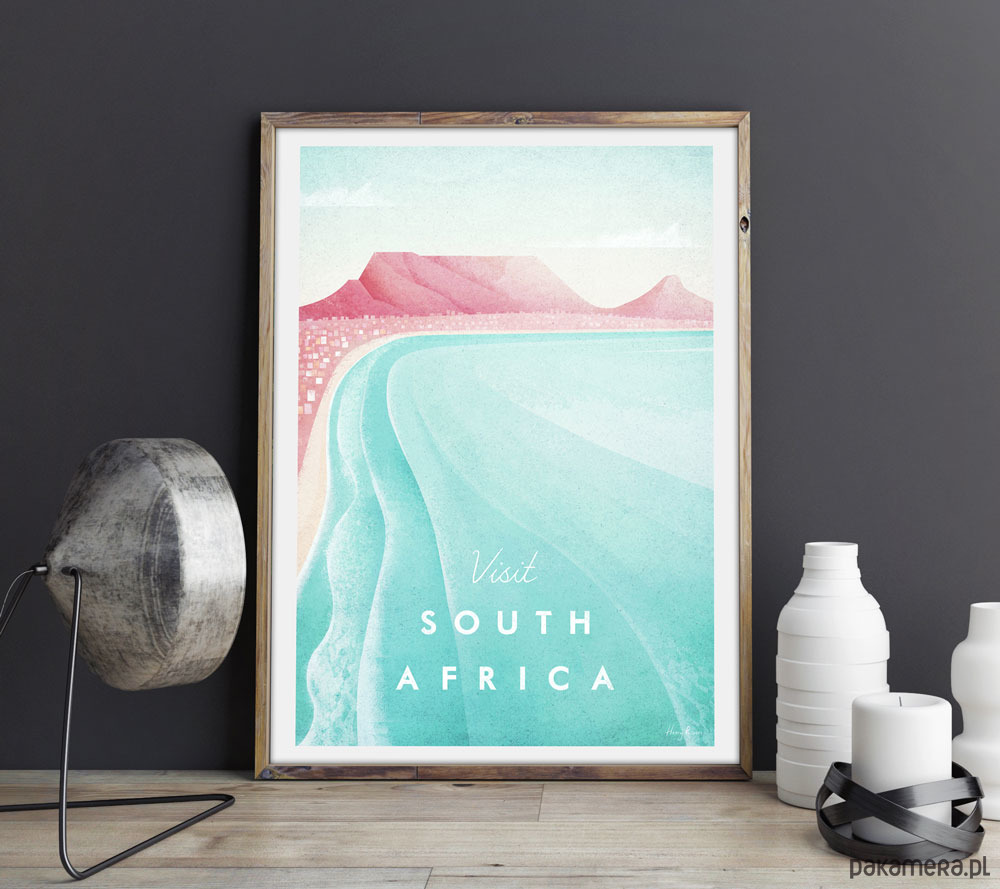 Autorski plakat w stylu vintage przedstawiający panoramę Góry Stołowej w Kapsztadzie w Południowej Afryce. Na pierwszym planie widoczne są rozległe fale nadciągające z potężnego oceanu. W tle widnieje płaskowyż Góry Stołowej górujący nad miastem. Inspirowany plakatami podróżniczymi z lat 20-tych XX wieku.