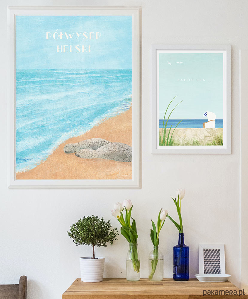 Plakat w stylu retro z Morzem Bałtyckim, przedstawiający piaszczystą plażę na Półwyspie Helskim.