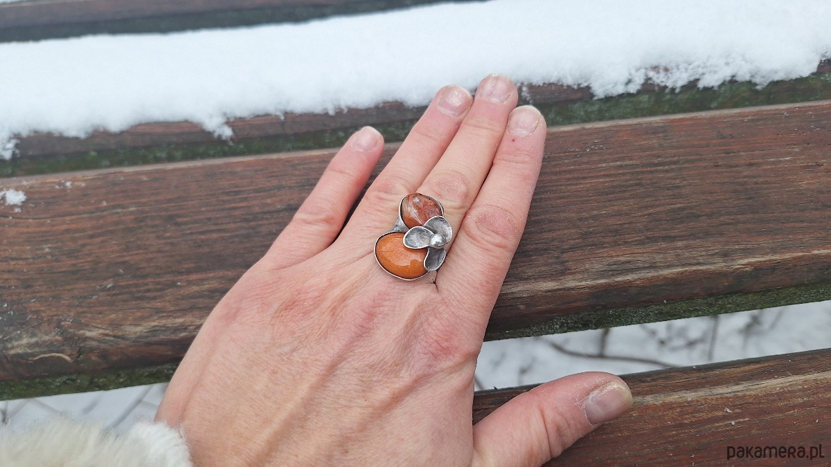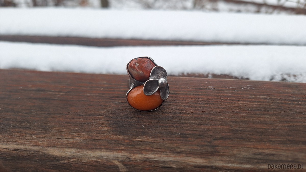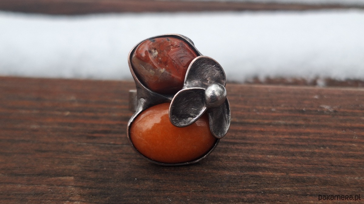 Pierścionek wykonany z miedzi, cyny, jaspisu i jadeitu. Wymiary ok. 2.5 na 2 cm. Regulowany. Nie jest ciężki.