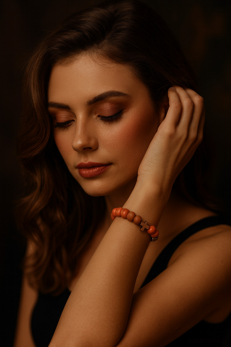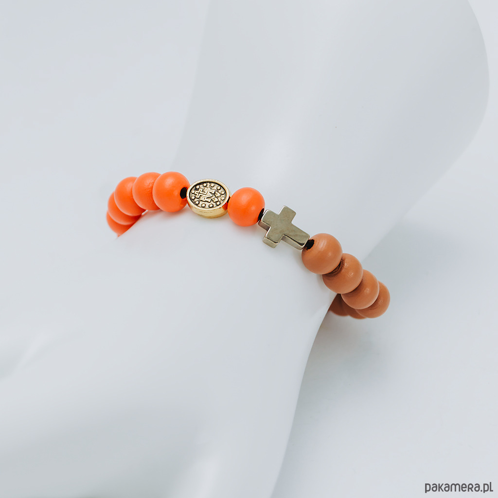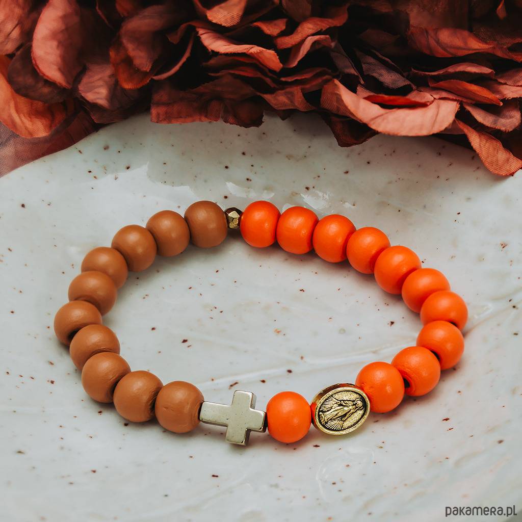 Pomarańczowa bransoletka z krzyżykiem, różaniec na rękę, drewno