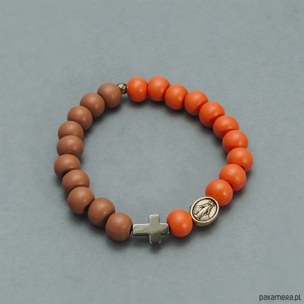 Ta piękna bransoletka - różaniec została wykonana z drewnianych koralików w dwóch kolorach - pomarańczowym i jasno brązowym, złoconego hematytu i medalika z wizerunkiem Matki Boskiej w kolorze złotym.