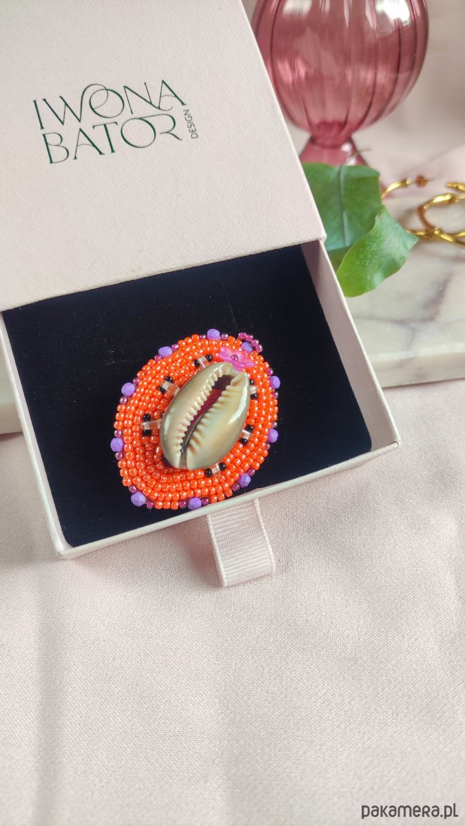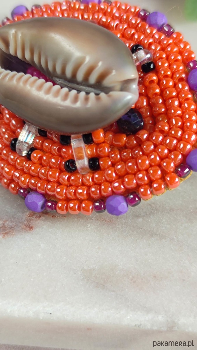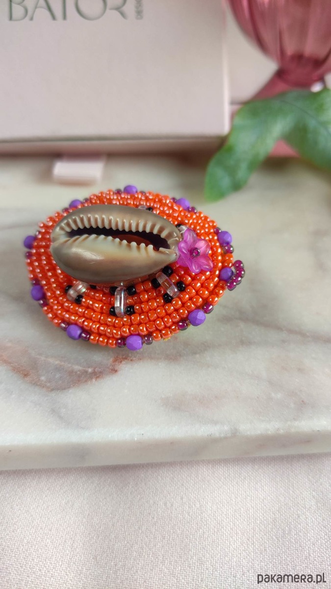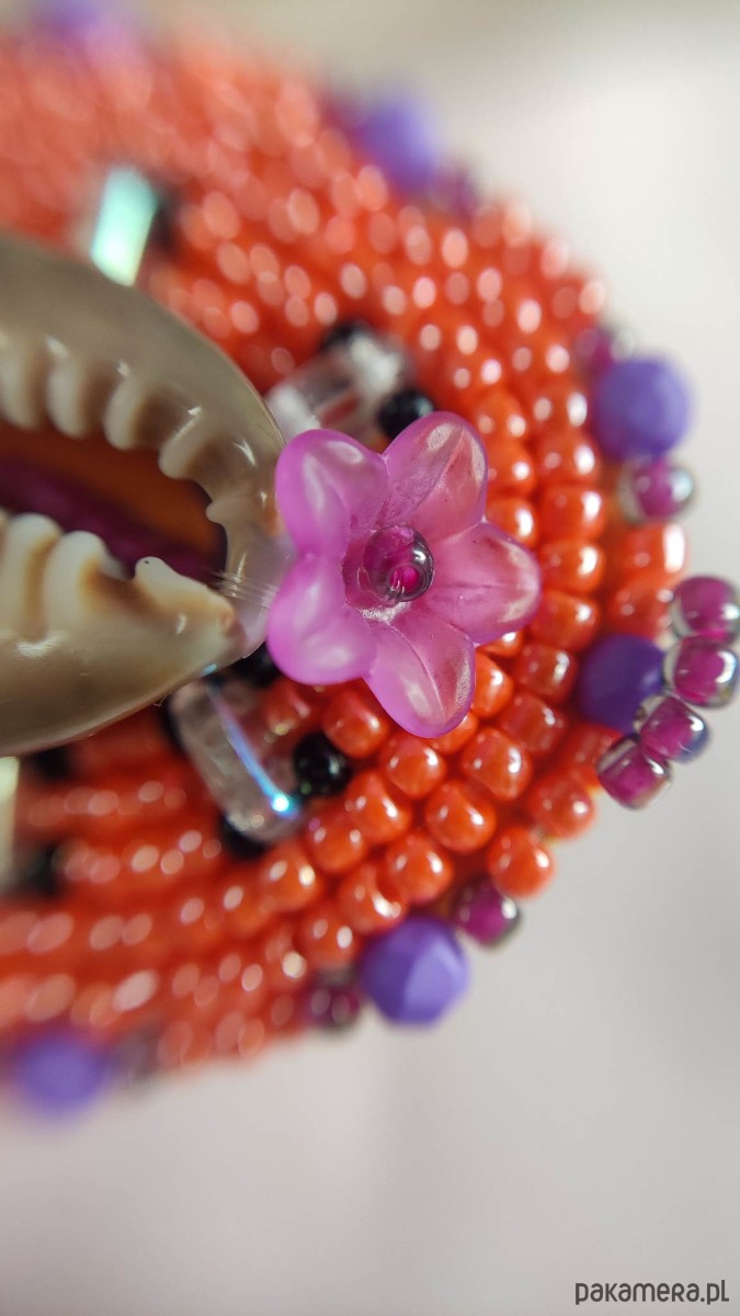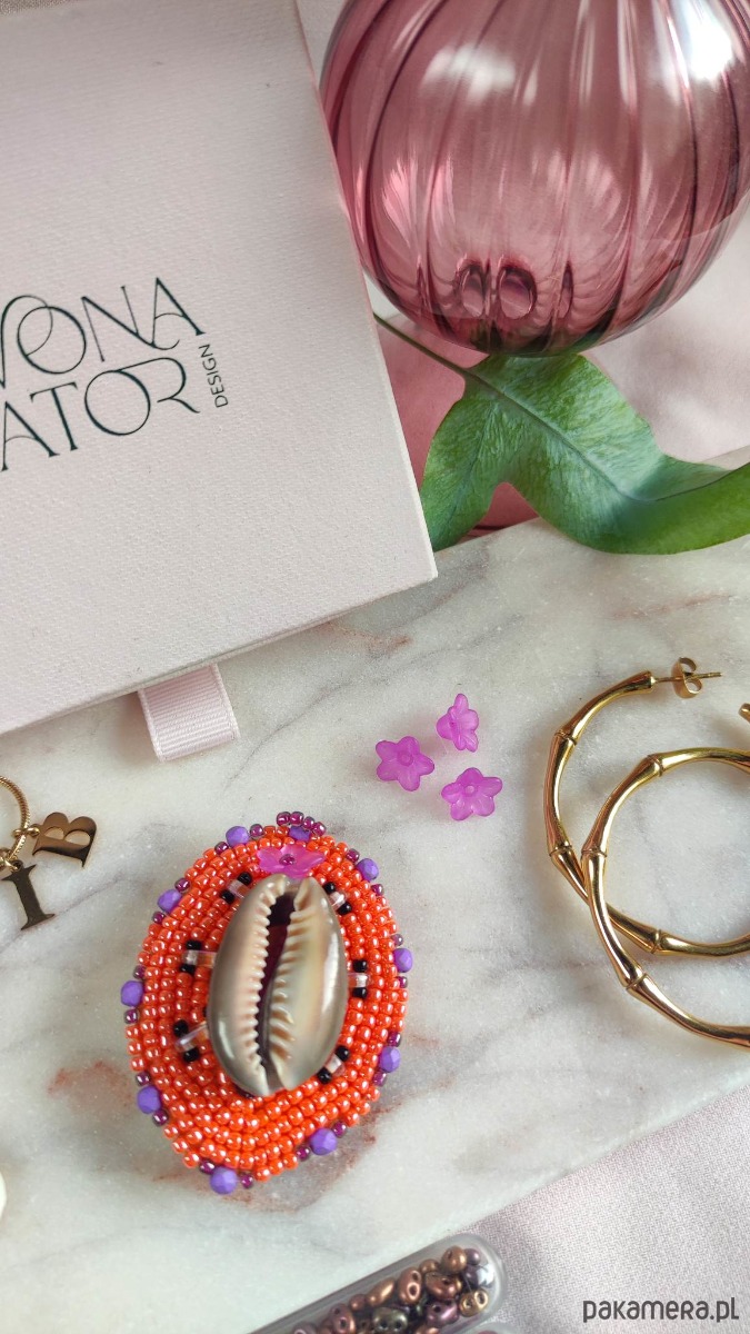Całość broszki jest ręcznie wyszyta drobnymi szklanymi japońskimi koralikami w różnych kolorach. Nad muszelką wszyty został uroczy akrylowy kwiatuszek. Pod muszelką, symbolem kobiecości, znajduje się koralik ametystu. Ametyst to kamień pomagający w rozwijaniu intuicji i w radzeniu sobie ze stresem. Wzmacnia też kreatywność i pomaga w realizacji w pomaga w realizacji pragnień. Tył broszki został podszyty skórą z upcycklingu za pomocą koralików i mocnej nitki, co zapewnia większą trwałość i elegancję. Zapięcie typu agrafka w kolorze złotym.