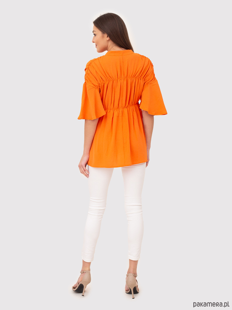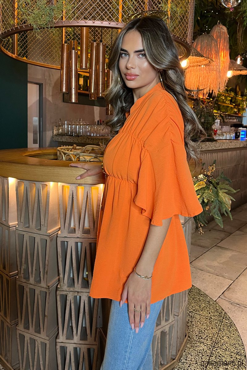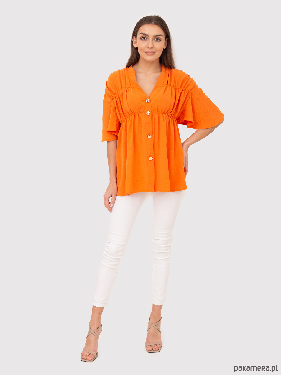 Pomarańczowy top z dekoltem w serek z marszczonymi guzikami to idealny wybór. Posiada marszczone detale na biuście i ramionach, szerokie krótkie rękawy i wyraziste złote guziki. Połącz go z dżinsami i szpilkami, aby uzyskać swobodny, ale wyrafinowany wygląd!