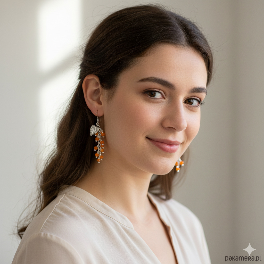 Długie, delikatne kolczyki gronka z pomarańczowym jadeitem. Kolczyki wykonane w naszej pracowni. Wygodne bigle haczyki, dobrze trzymają się na uszach.