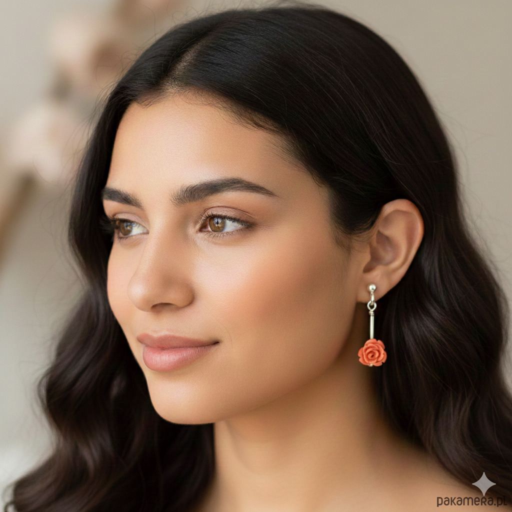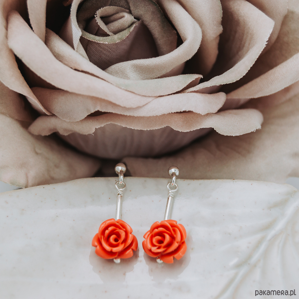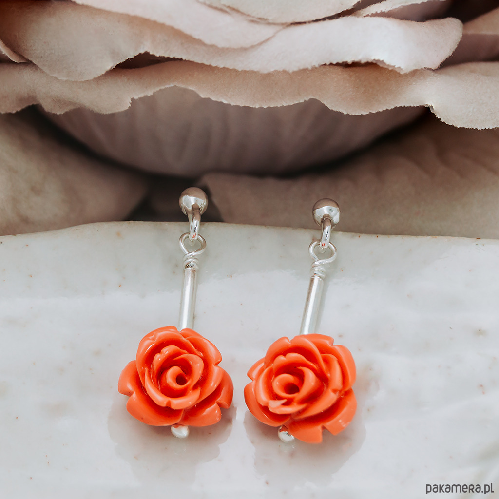 Pomarańczowe kolczyki z koralem, kolczyki z różyczką, srebro 925