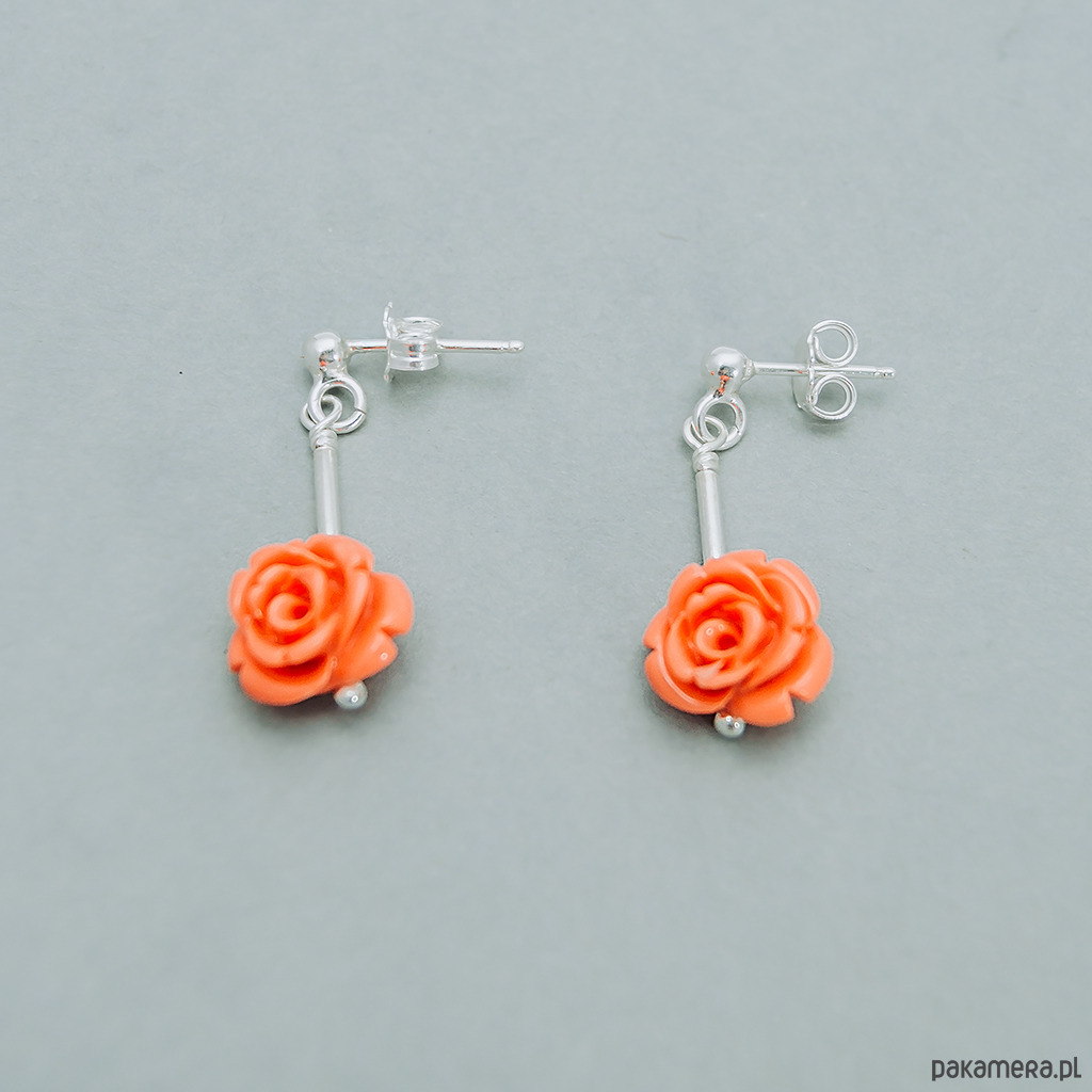 Kolczyki wykonane w naszej pracowni w Polsce. Te subtelne kolczyki wykonane zostały ze srebra z różyczką z korala w kolorze pomarańczowym. Wygodne bigle sztyfty dobrze trzymają się na uszach.