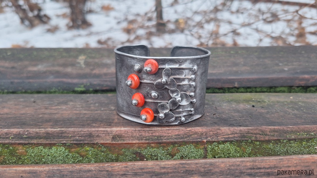 Bransoletka wykonana z miedzi, cyny i koralowców. Szerokość 4.5 cm. Regulowana.