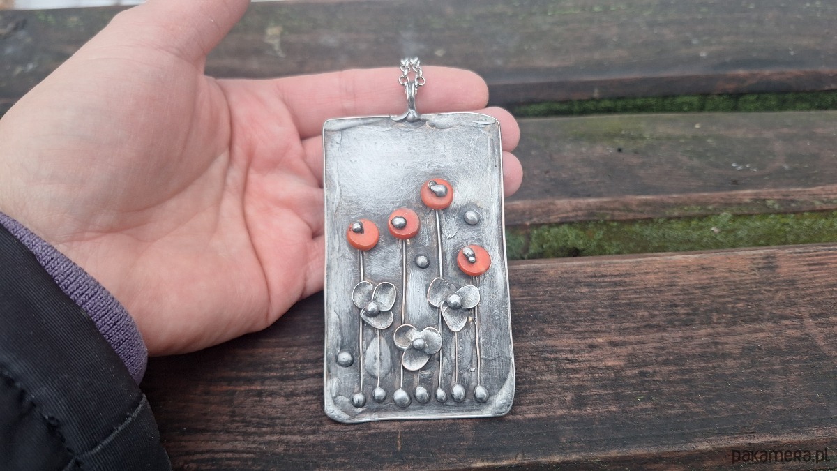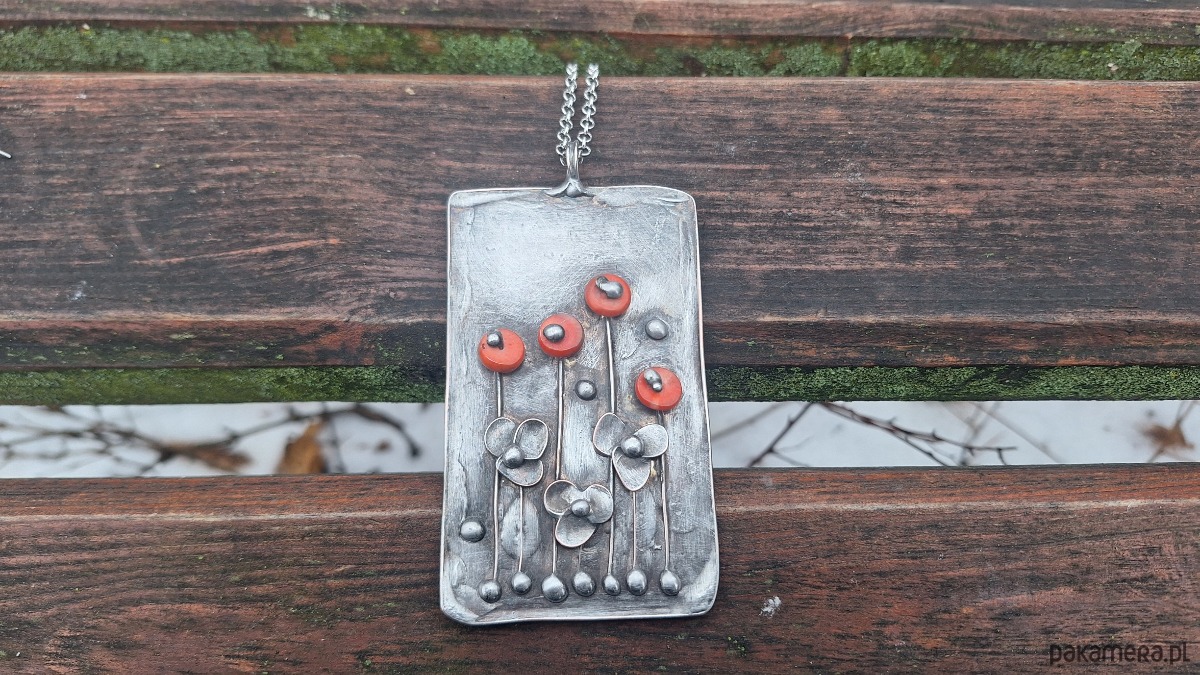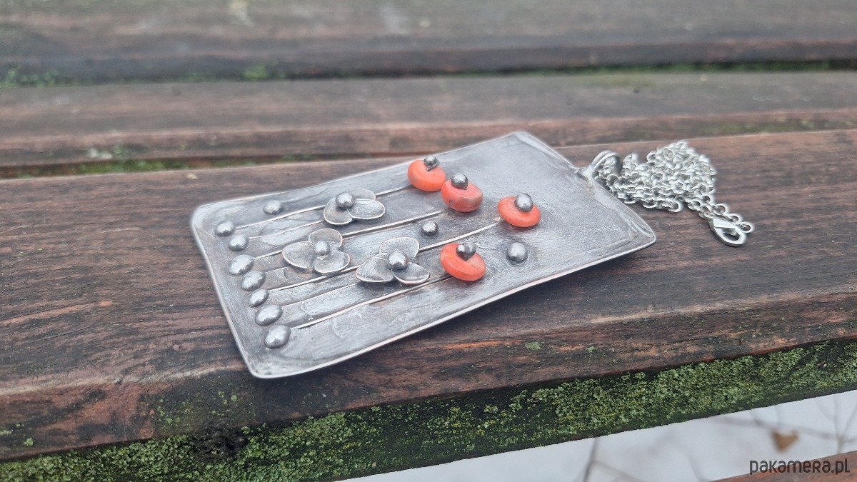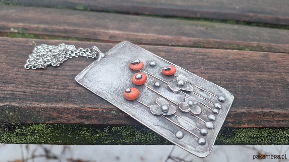 Wisiorek wykonany z miedzi, cyny i koralowców. Wymiary ok. 9 na 5.5 cm. Zawieszony na łańcuszku o długości ok. 50 cm.