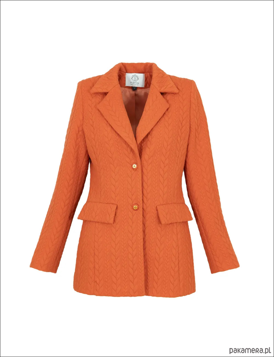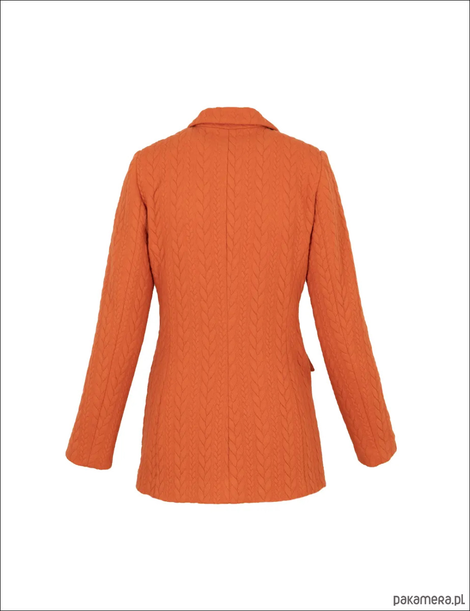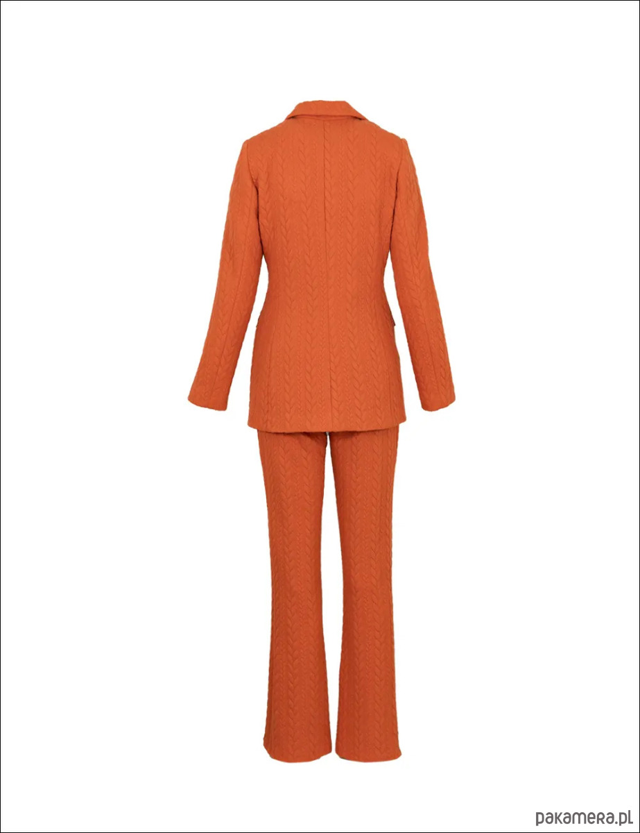 Przedstawiamy Wam pomarańczowy garnitur z wzorem warkocza, który świetnie sprawdzi się na wiele okazji. W skład zestawu wchodzi marynarka zapinana na ozdobne guziki oraz rozkloszowane spodnie zapinane po boku. Garnitur uszyty z ciepłej i przyjemnej w dotyku tkaniny.