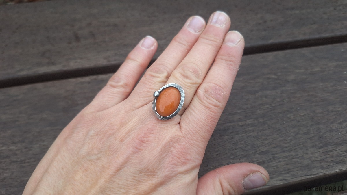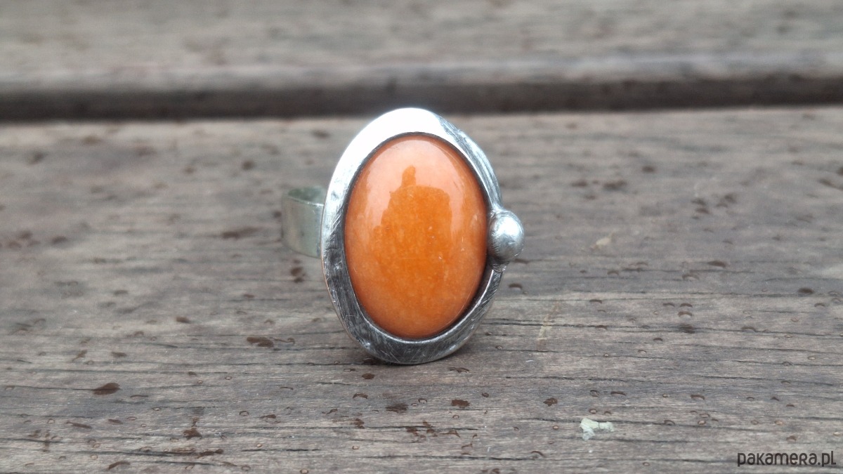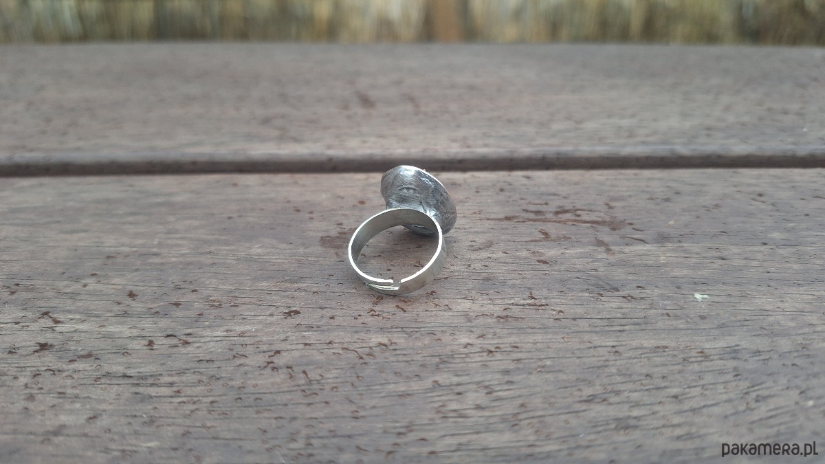 Pierścionek wykonany z miedzi, cyny i jadeitu. Wymiary ok. 2 na 1.5 cm. Regulowany. Nie jest ciężki.