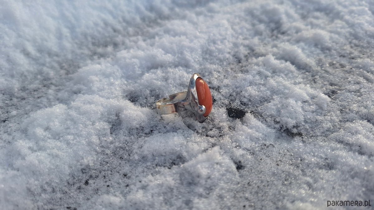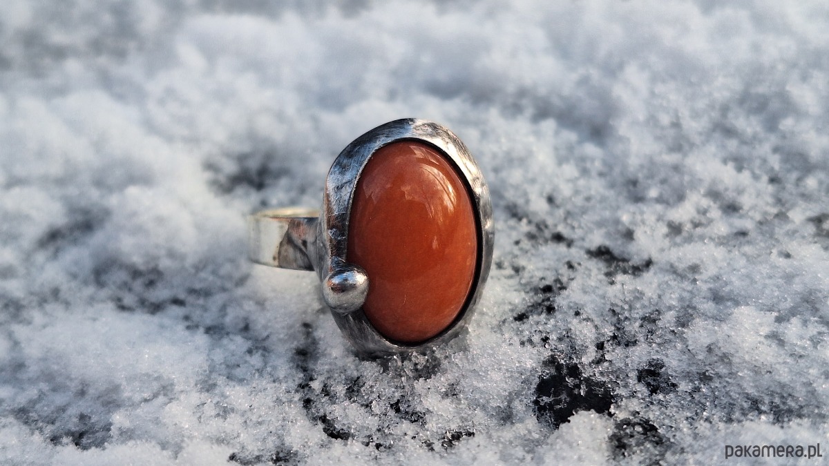 Pierścionek wykonany z miedzi, cyny i jadeitu. Wymiary ok. 2 na 1.5 cm. Regulowany. Nie jest ciężki.