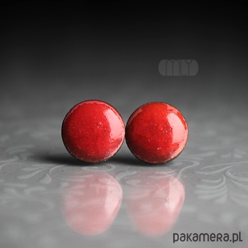 Ceramiczne okrągłe kolczyki w formie sztyftów, ręcznie wykonane z delikatnej gliny kamionkowej, jednostronnie szkliwione intensywnym pomarańczowo-czerwonym szkliwem z efektem plamek i pięknym połyskiem, na antyalergicznych sztyftach w kolorze srebrnym..Średnica ok. 14mm.. Polecam
