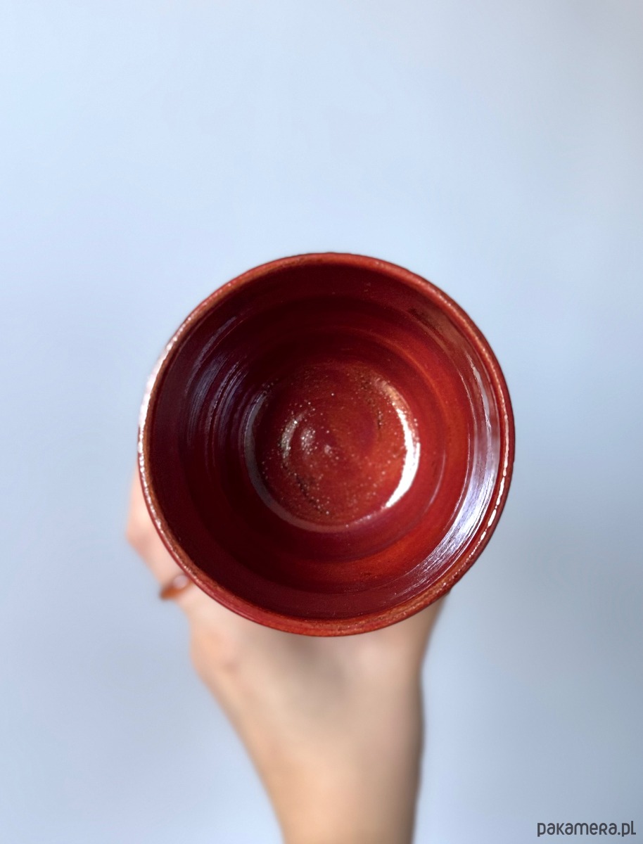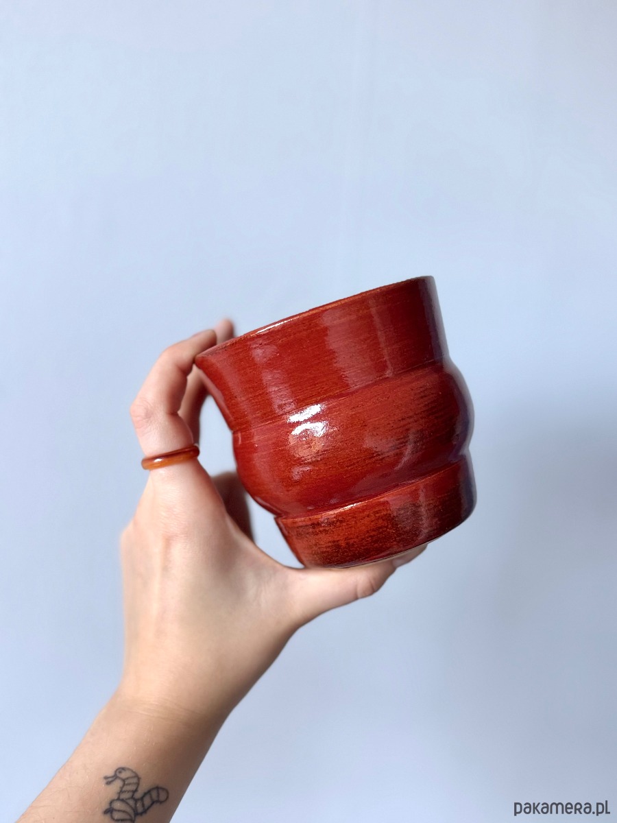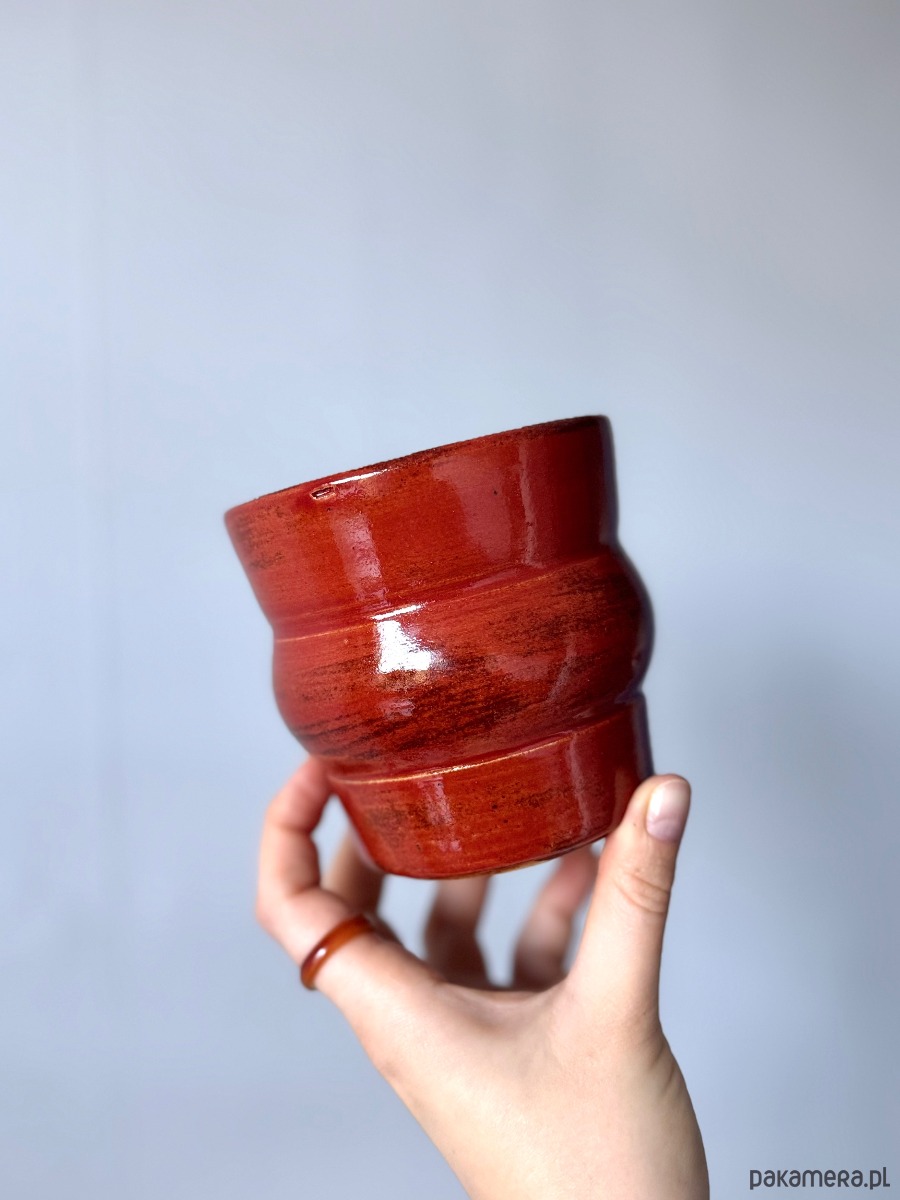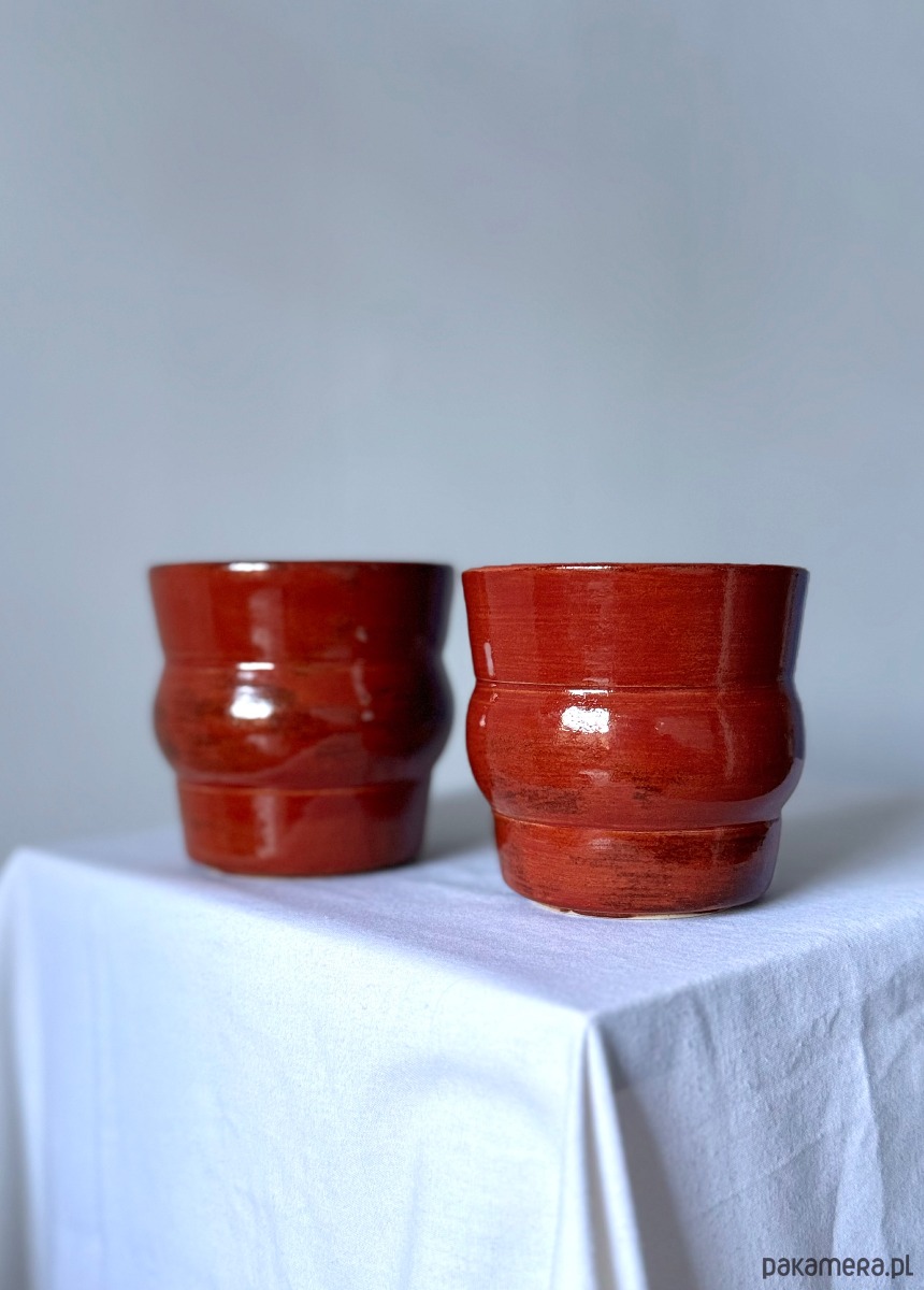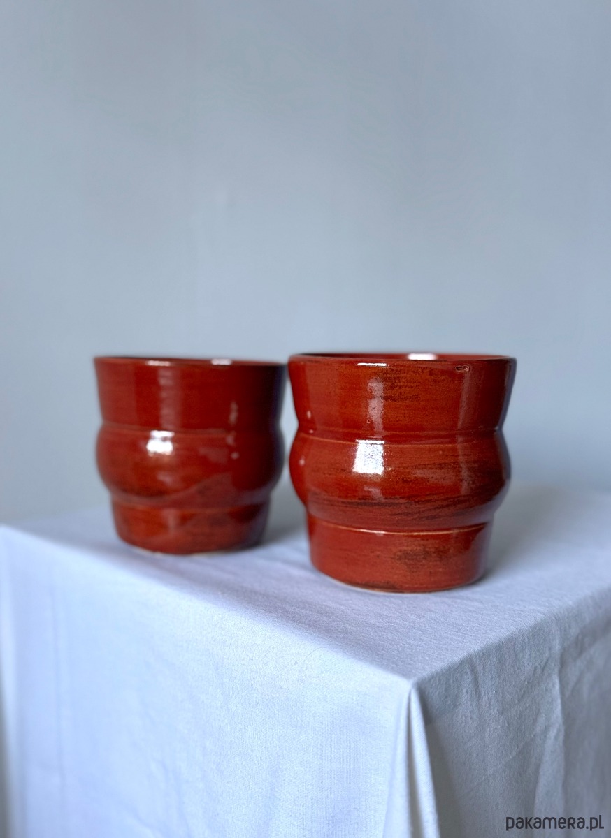 Kamionkowe kubki ceramiczne bez uchwytów. Kubki zostały wytoczone na kole garncarskim, a następnie pokryte szkliwem w odcieniu pomidorowej czerwieni. Odcień jest ciepły, z widocznymi, rdzawymi przecierkami. Ich kształt rozszerza się ku górze, a charakterystyczne, okrągłe wybrzuszenie znajdujące się w połowie wysokości sprawia, ze wyglądają nowocześnie oraz idealnie leżą w dłoni.