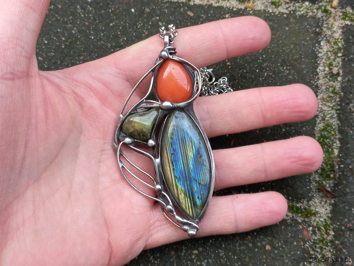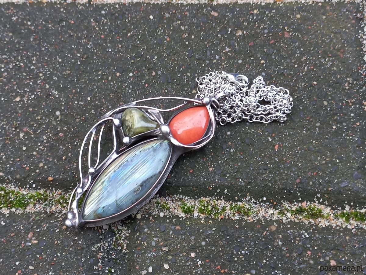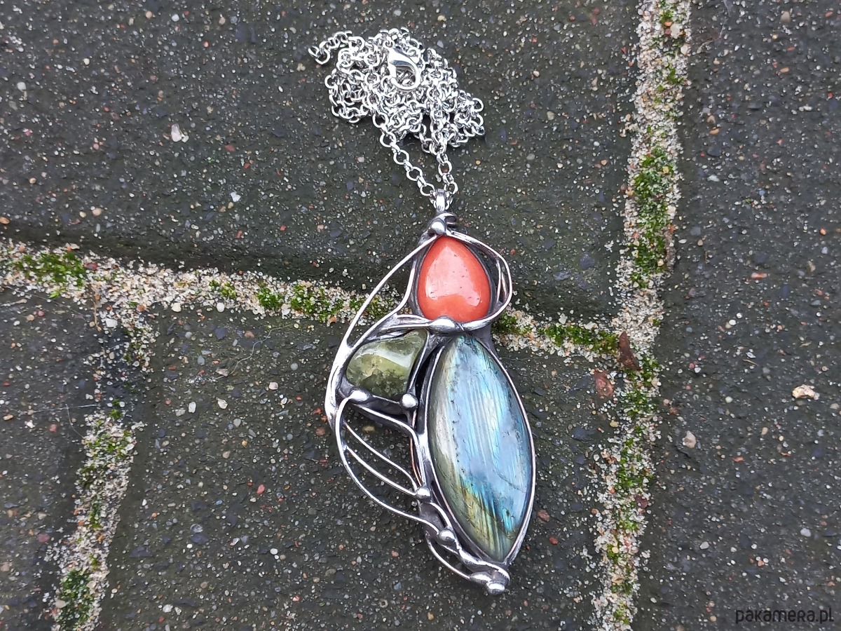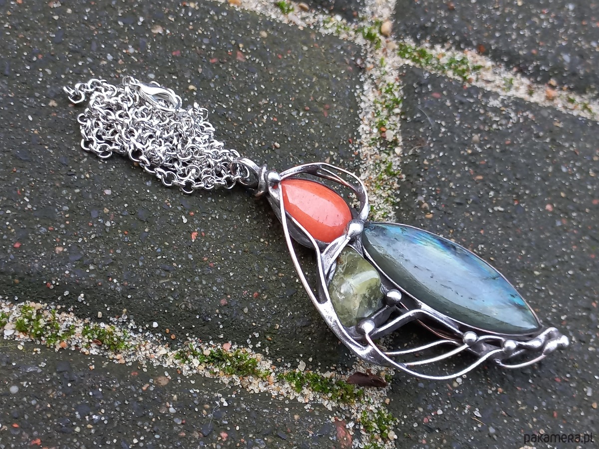 Wisiorek wykonany z miedzi, cyny, jadeitu, zielonego granatu i labradorytu. Wymiary ok. 7,5 na 4 cm. Zawieszony na łańcuszku o długości ok. 50 cm.