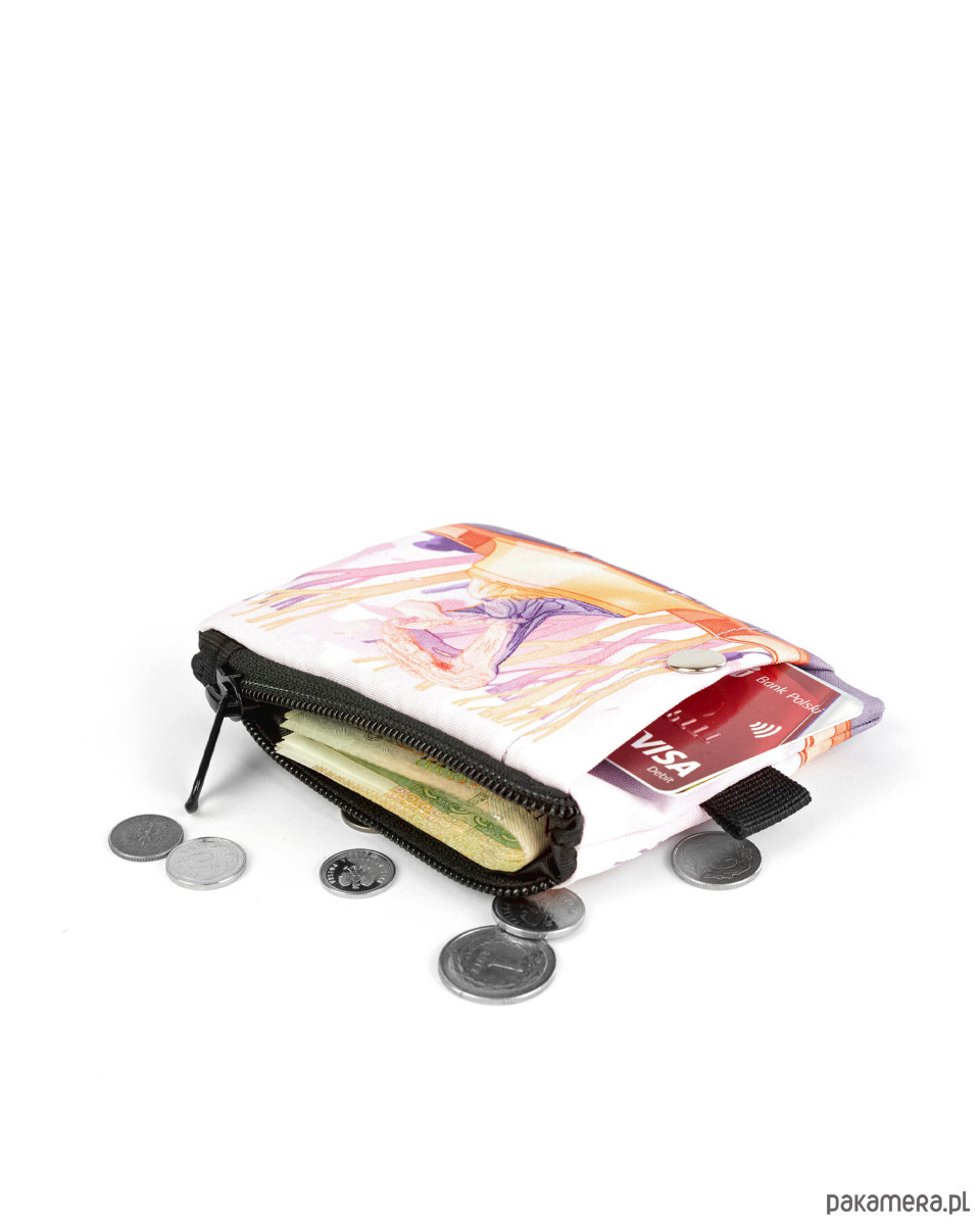 Główna komora zapinana na zamek, boczna kieszeń na karty zapinana na zatrzask.