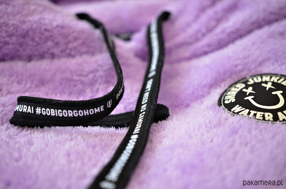SHRED JUNKIES WATER ADDICTS - naszywka z ekoskórki na wysokości biustu, która manifestuje Twoje zdrowe uzależnienie. Żakard na rękawie, długie troki z kaptura.