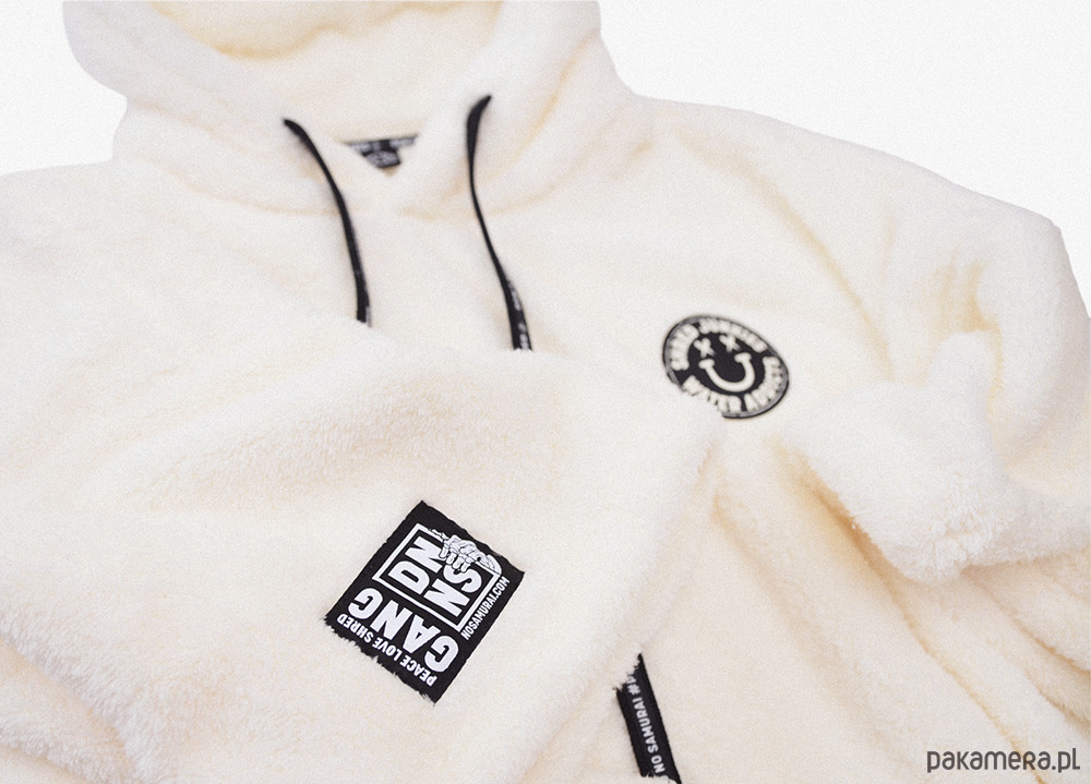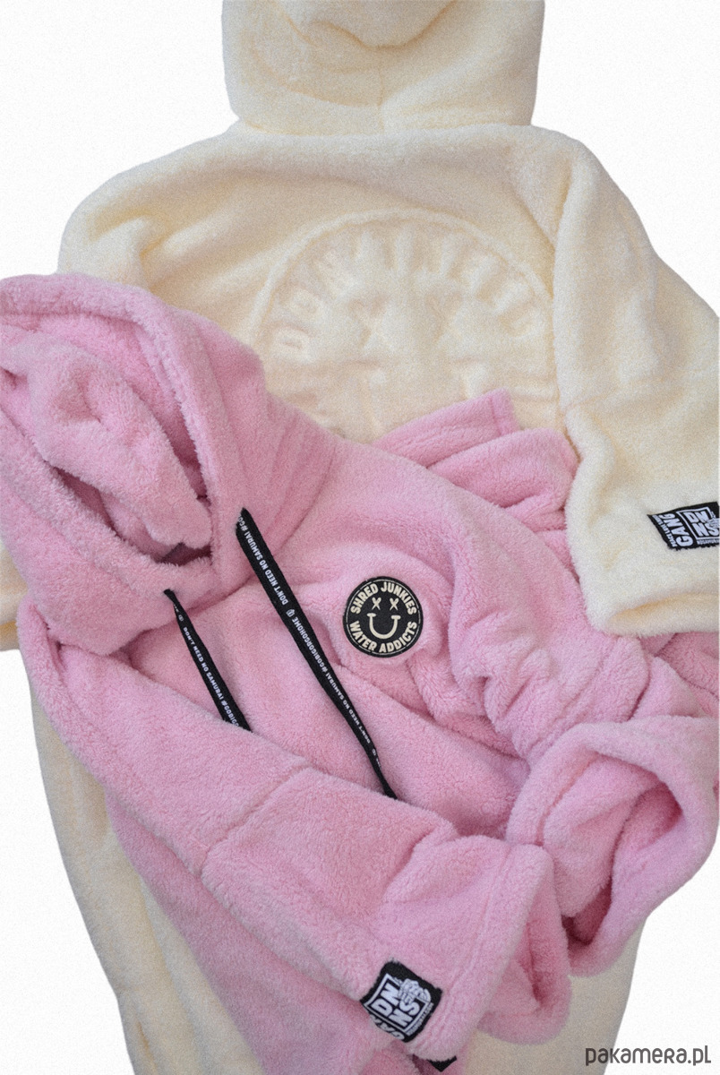 SHRED JUNKIES WATER ADDICTS - naszywka z ekoskórki na wysokości biustu, która manifestuje Twoje zdrowe uzależnienie. Żakard na rękawie, długie troki z kaptura i haft z gargantuicznym uśmiechem z tyłu.