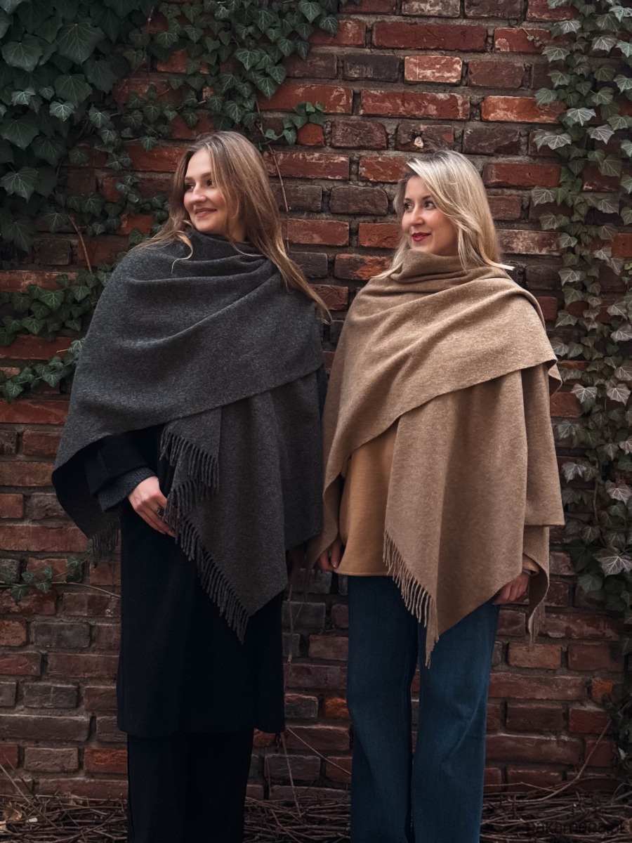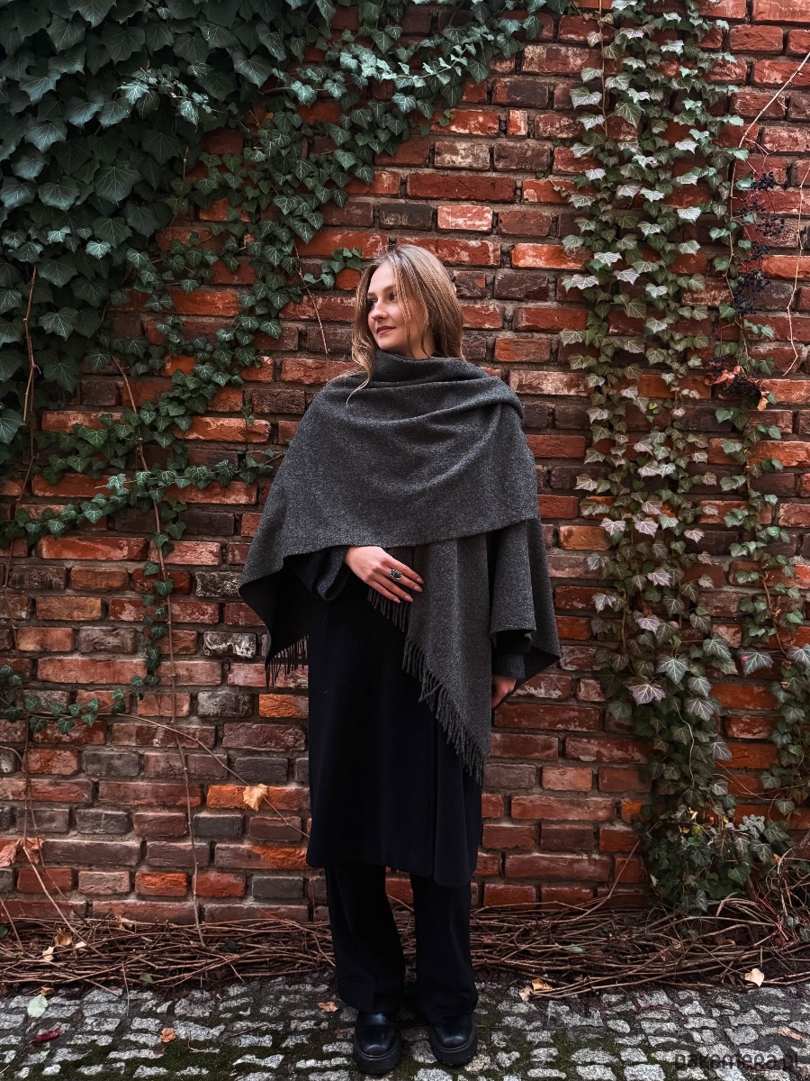Ponczo wykonane z wełny Lambswool (pierwsze strzyżenie jagnięcia) jest niezwykle delikatna, lekka i nie "gryzie", jednocześnie zapewniając doskonałą izolację termiczną.