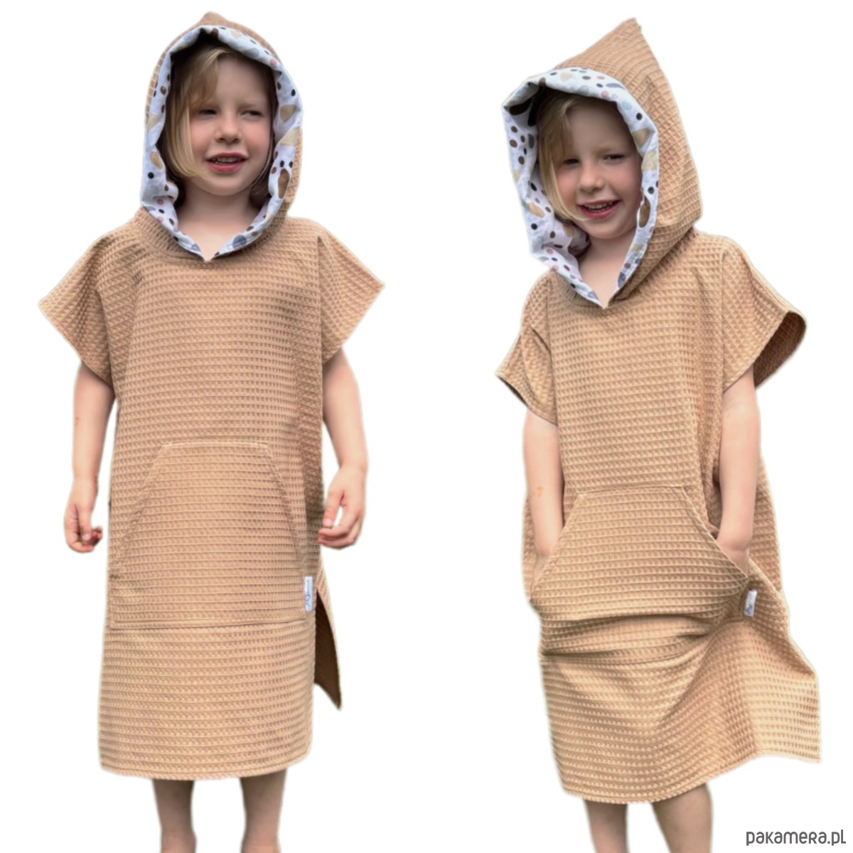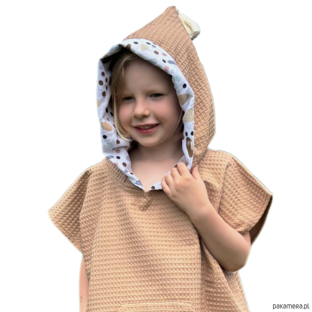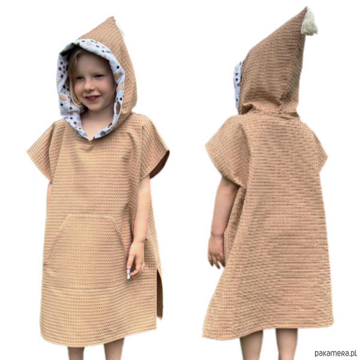Nasze ponczo to coś więcej niż tylko okrycie po kąpieli – to miękki, ciepły kokon, który otula Twoje dziecko z troską i czułością. Wchłania wodę dużo lepiej niż klasyczne ręczniki frotte, schnie błyskawicznie, zatrzymując ciepło, kiedy najbardziej tego potrzeba. Jest lekkie jak chmurka i na tyle kompaktowe, że bez trudu zmieści się nawet do małego plecaka. Kapturek zadba o mokrą główkę, a urocza kieszonka z przodu pomieści wszystkie małe skarby z plaży – muszelki, kamyczki i inne dziecięce znaleziska.