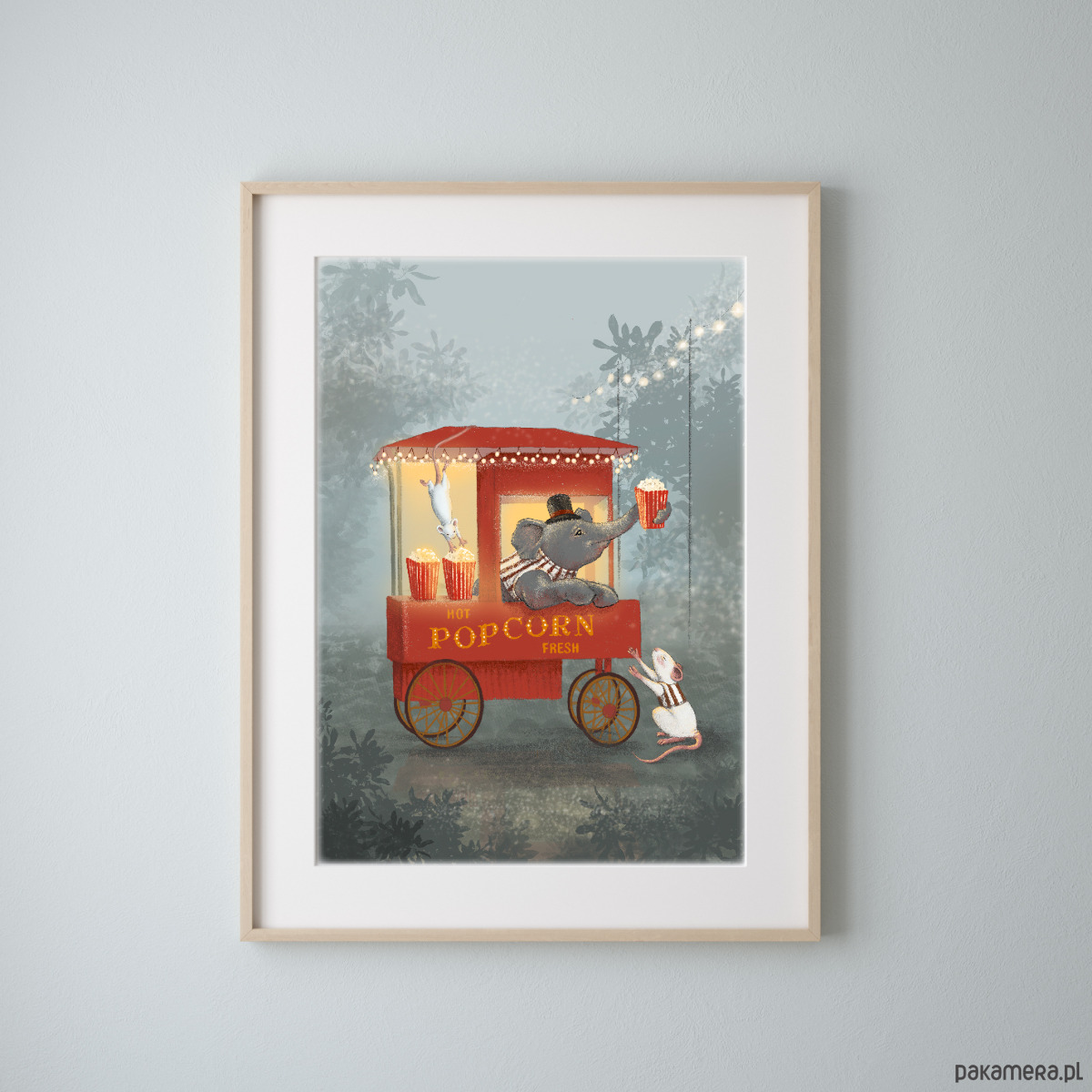Plakat, który skradnie serca zarówno dzieci, jak i dorosłych! Przedstawiamy uroczego słonika wraz z mysią pomocnicą, sprzedających popcorn w chłodny dzień. To prawdziwa gratka dla miłośników magii i przygód!