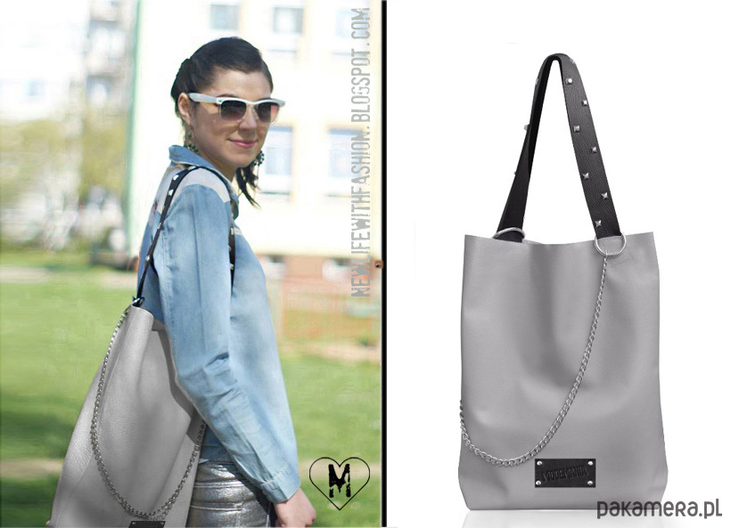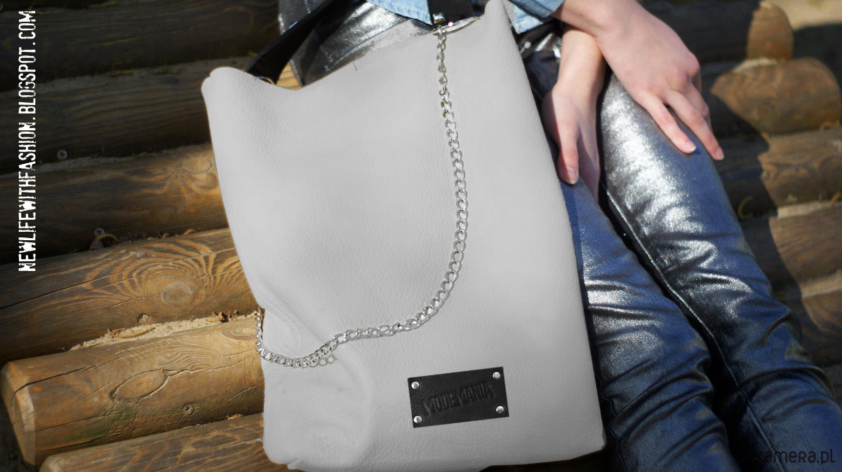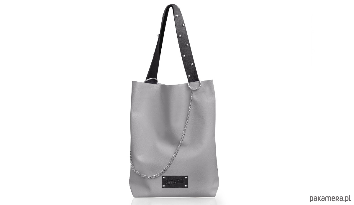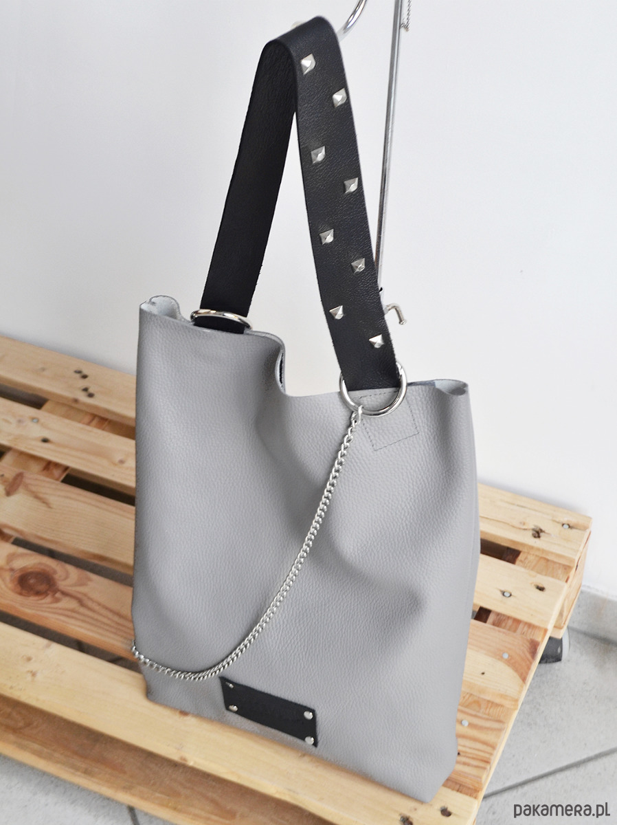 Popielaty worek na ramię wykonana z wysokiej jakości skóry naturalnej.