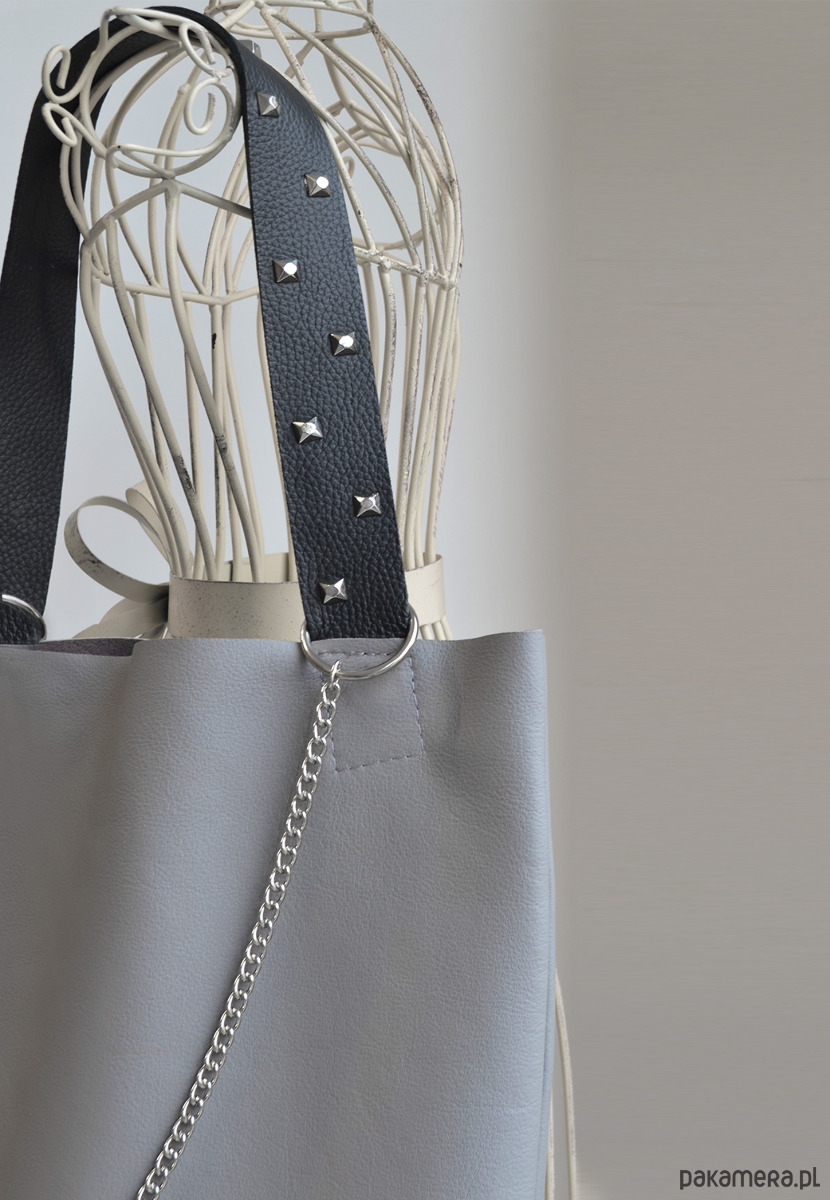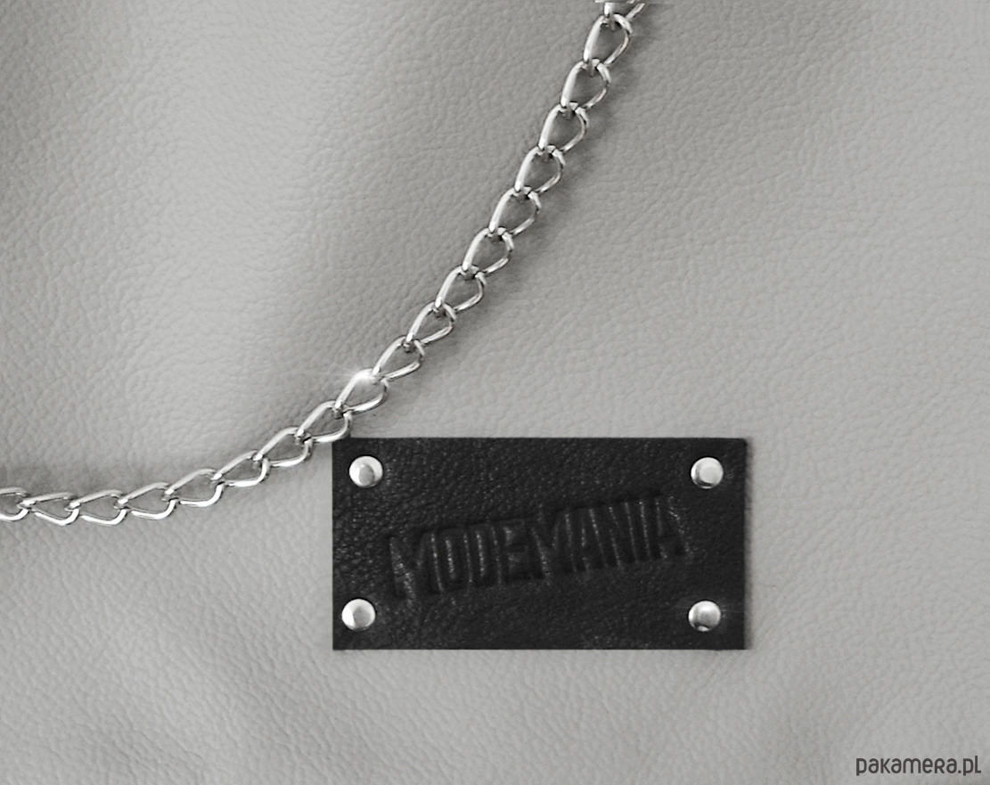 Na froncie metalowy łańcuch i skórzana metka przybita nitami.