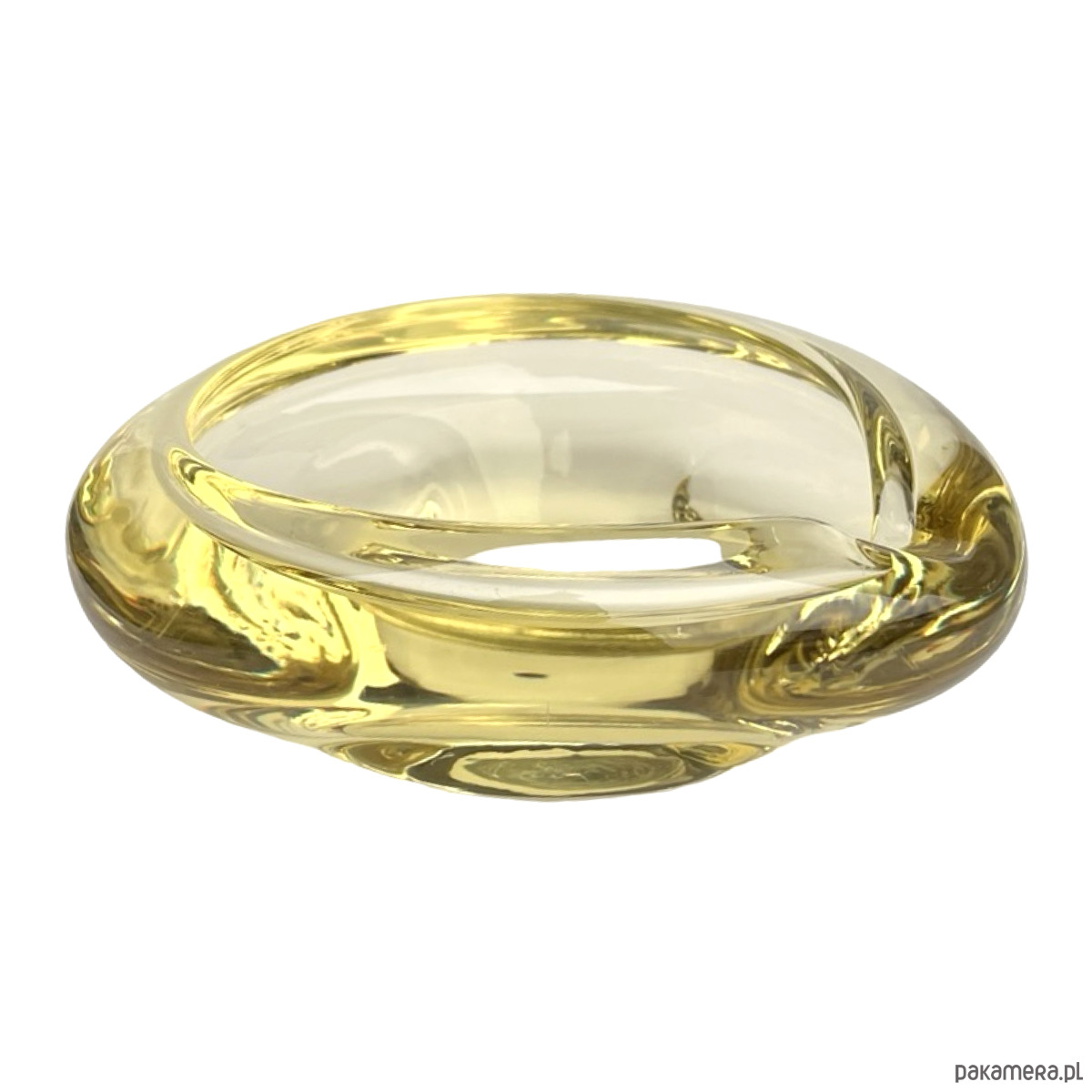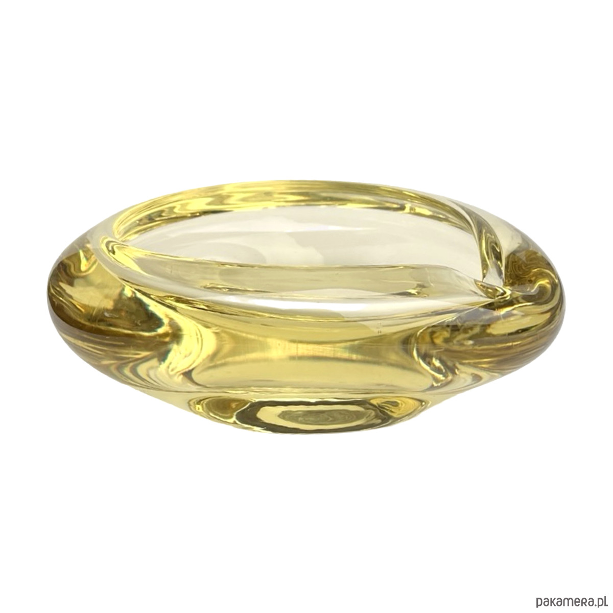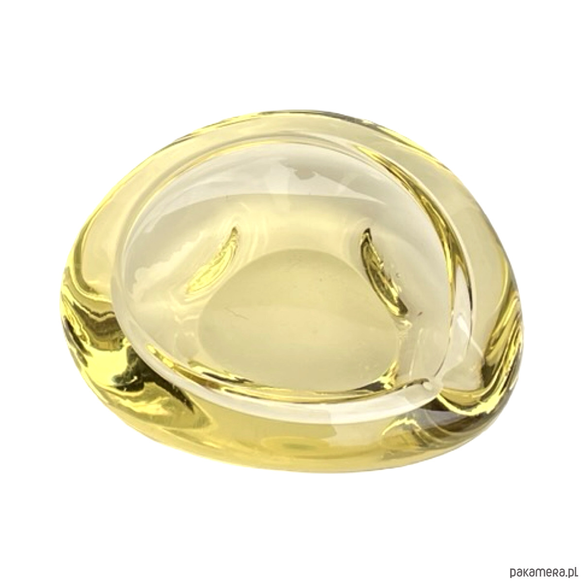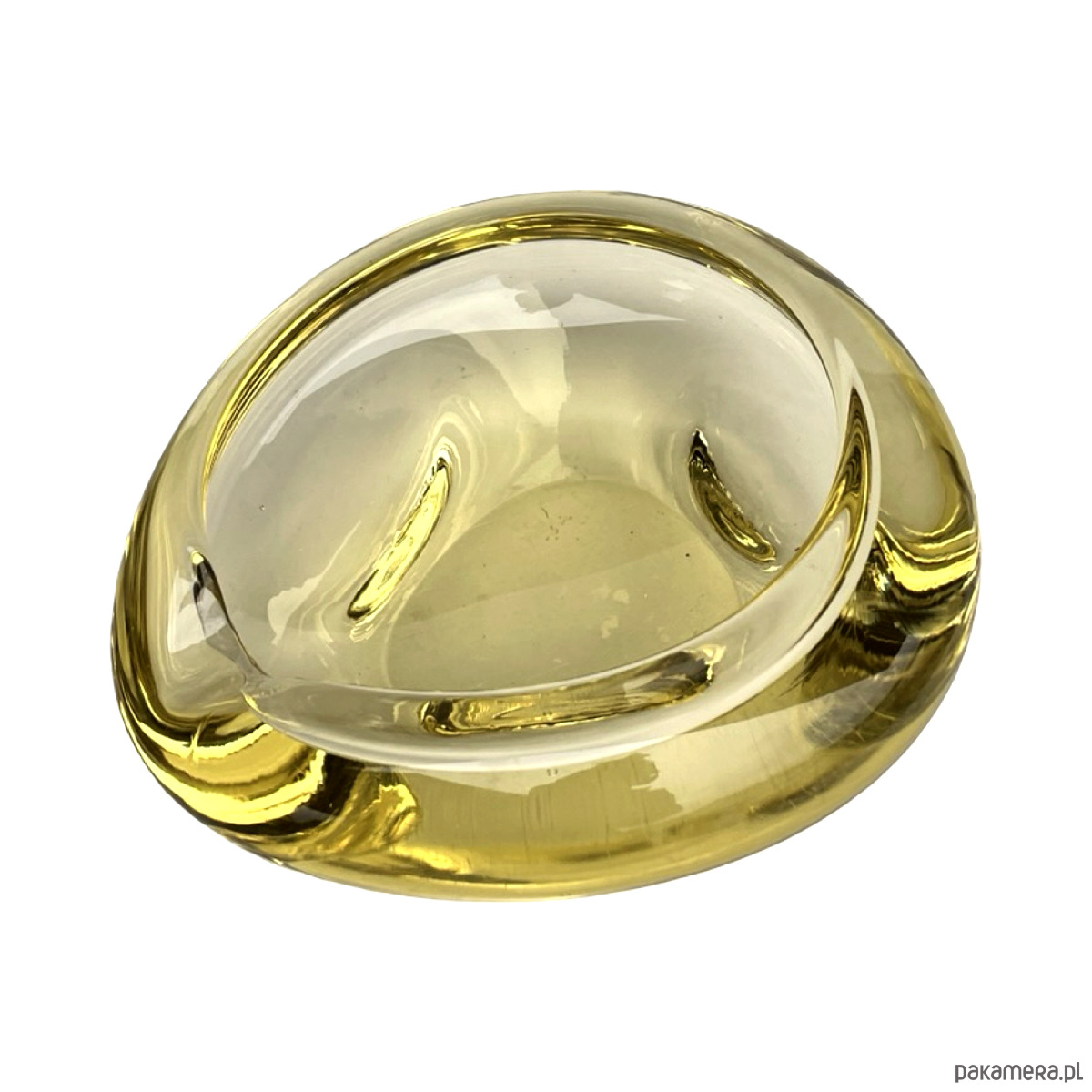 Wyjątkowa popielnica artystyczna projektu Miloslava Klingera dla Železný Brod Sklo z lat 60. XX wieku. Wykonana ręcznie z grubego szkła o pięknym, jasnożółtym odcieniu. Charakterystyczna organiczna forma z płynnymi liniami i dynamicznymi załamaniami światła to znak rozpoznawczy czeskiego designu tamtej epoki.