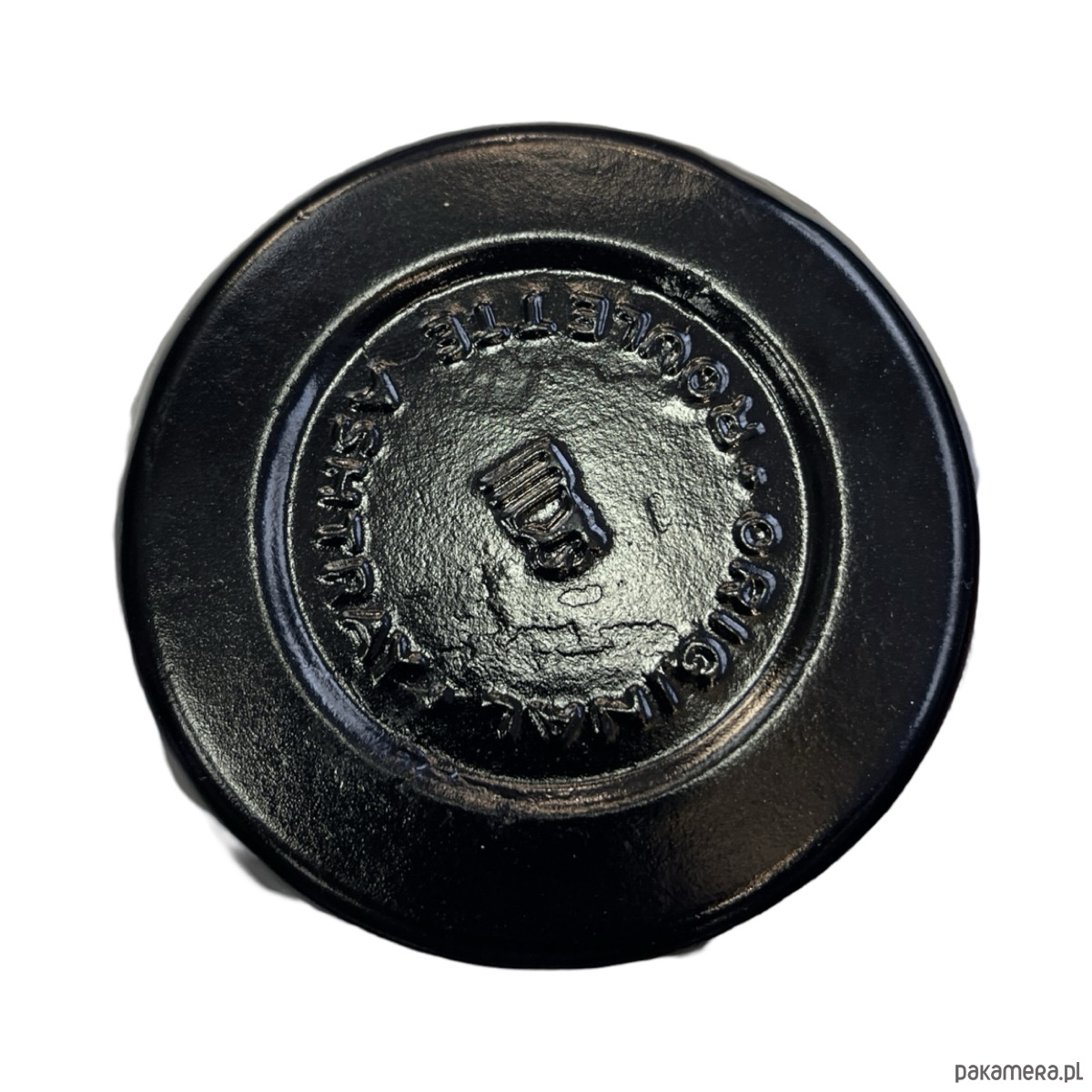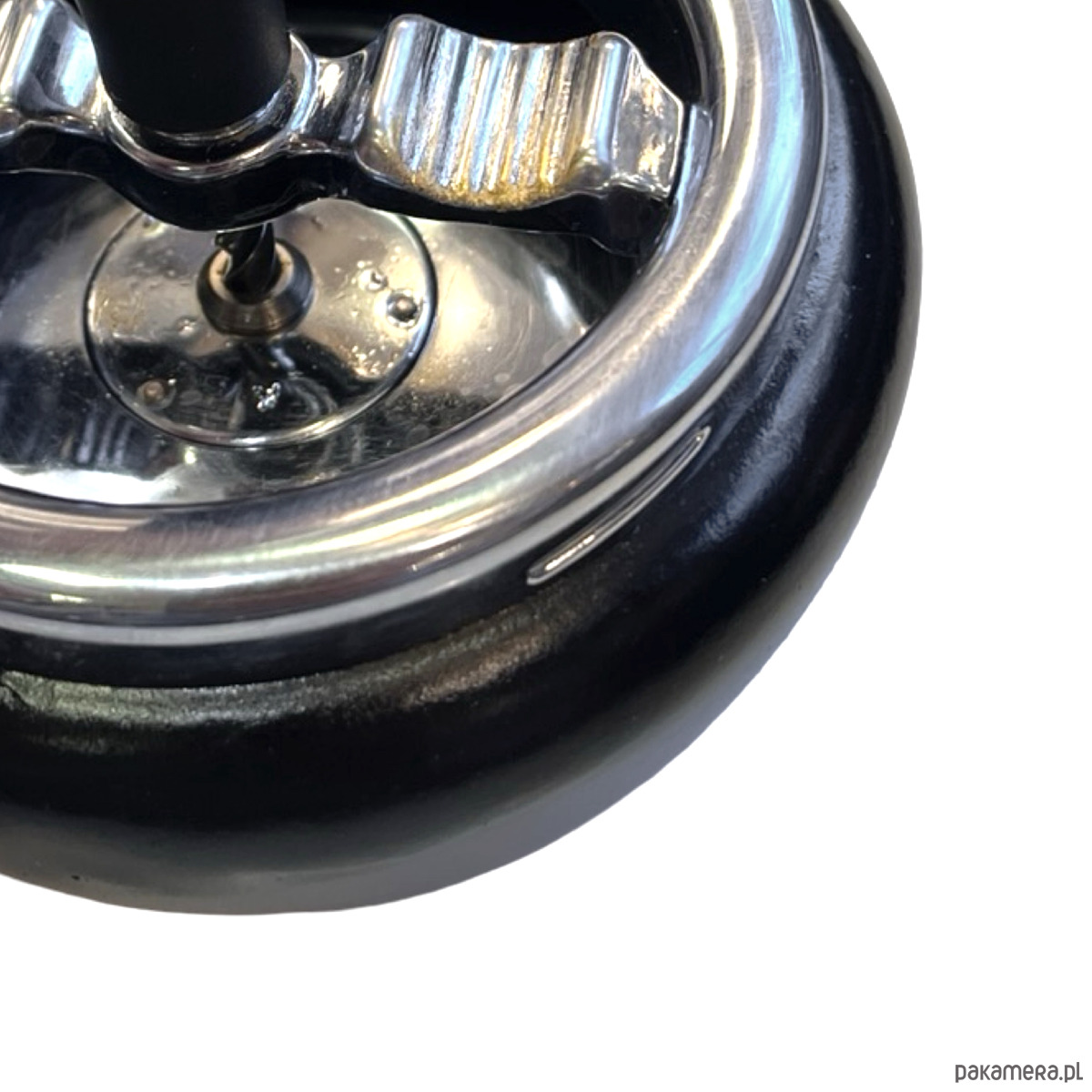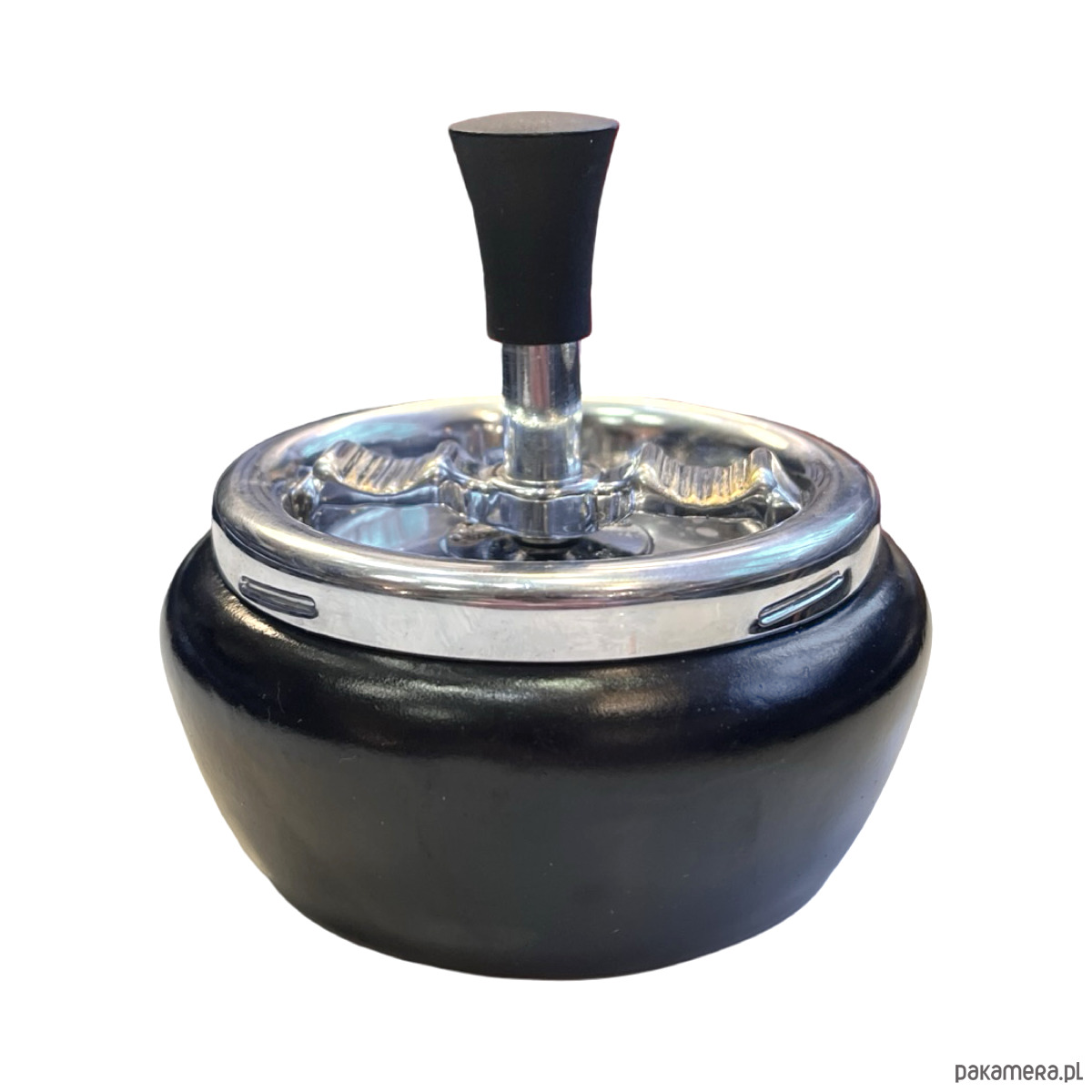 Na górze jest czarny uchwyt z bakelitu który naciskasz, aby popielniczka się obracała. Jest w pełni sprawny. Na mostku znajdują się dwa wgłębienia na papierosa lub cygaro.
