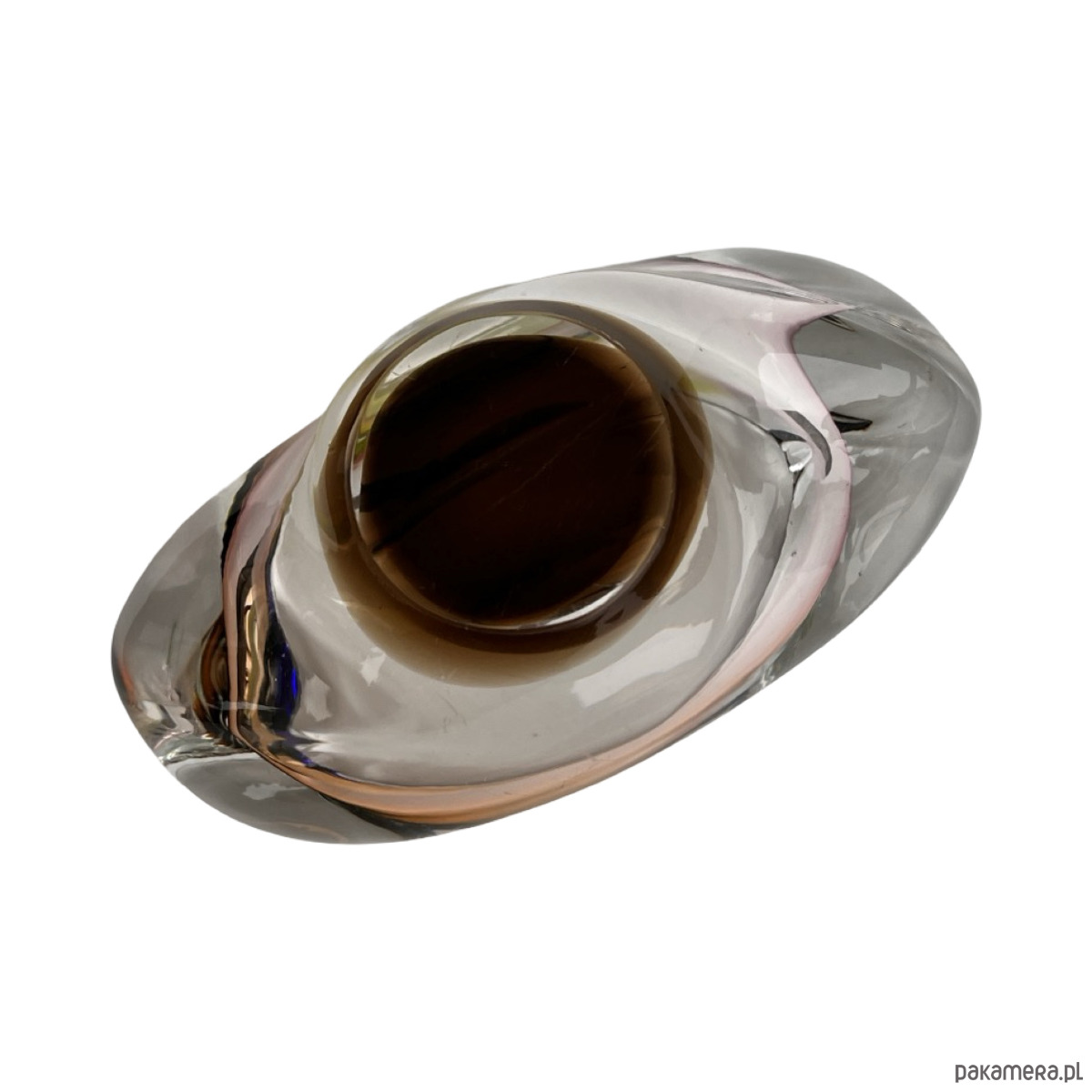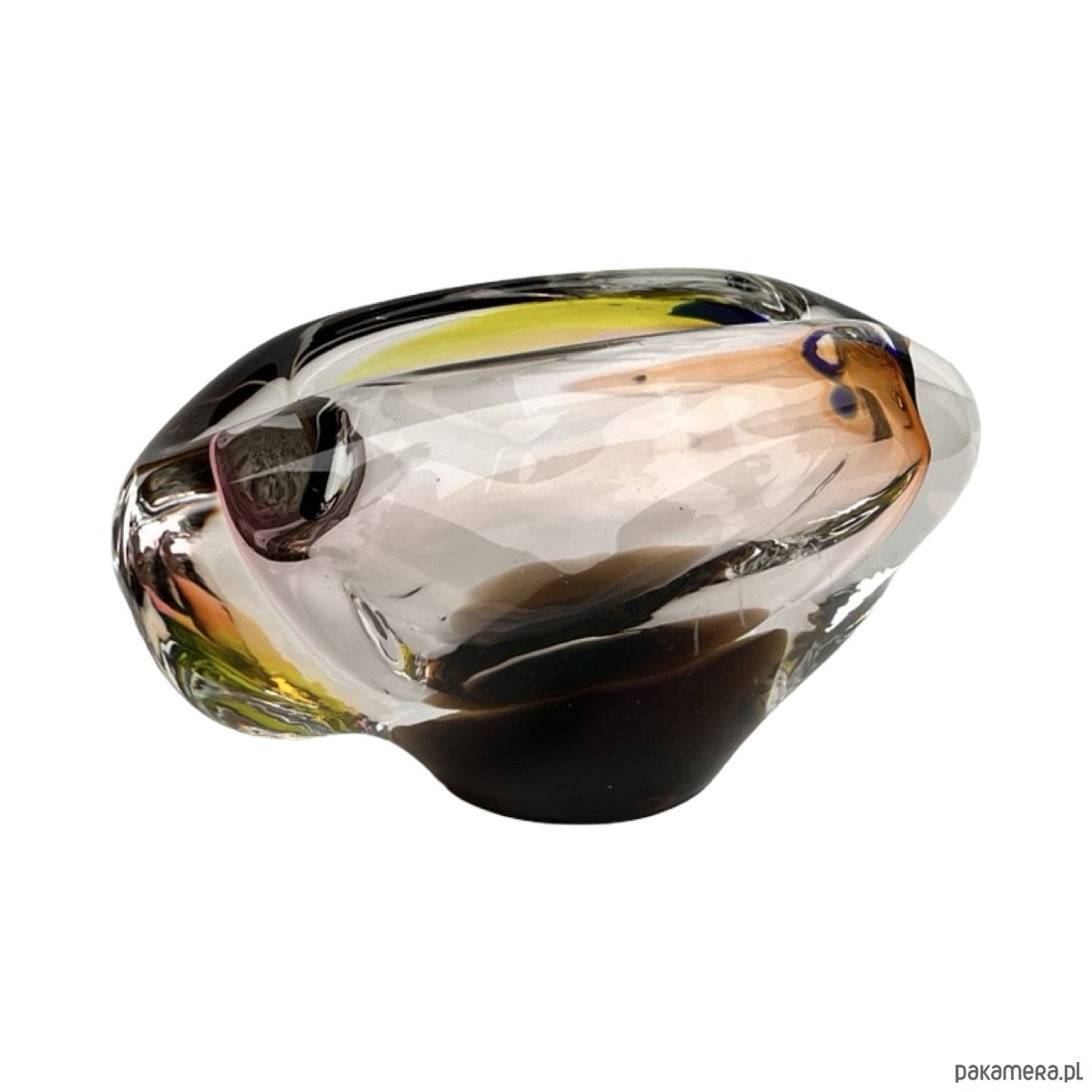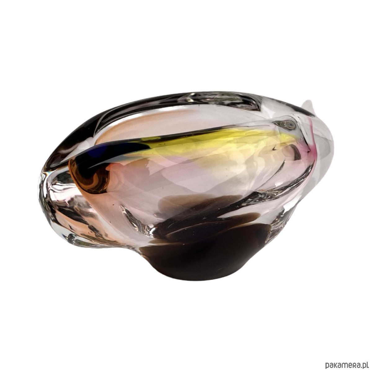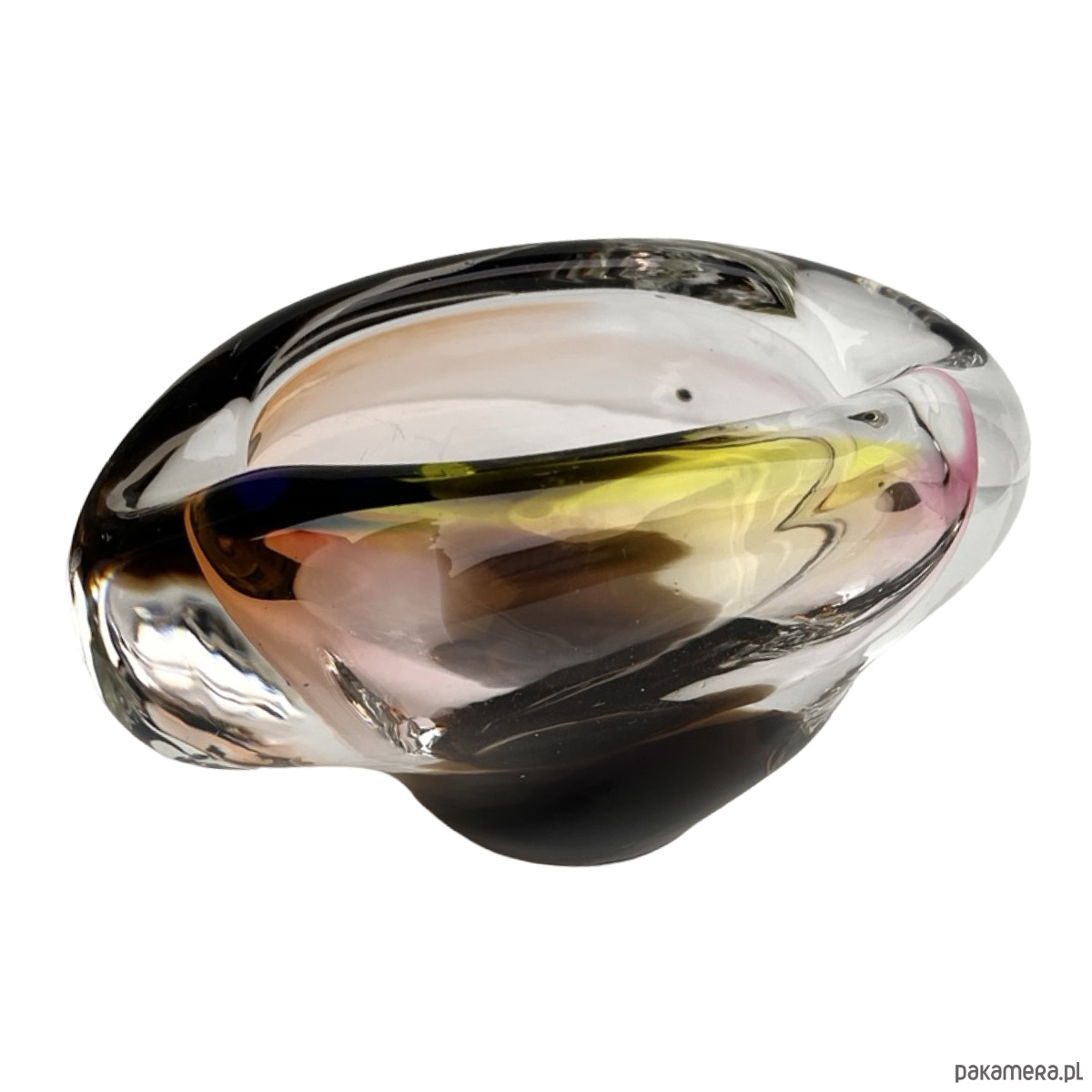 Artystyczna popielniczka ze szkła hutniczego o dynamicznej formie organicznej, zaprojektowana przez Jozefa Rozinka dla Borocrystal Nový Bor w Czechosłowacji. Wykonana w technice sommerso — z zatopionymi warstwami barw: bursztynowej, różowej, żółtej i granatowej, które tworzą efekt głębi i ruchu charakterystyczny dla czeskiego szkła artystycznego lat 70.